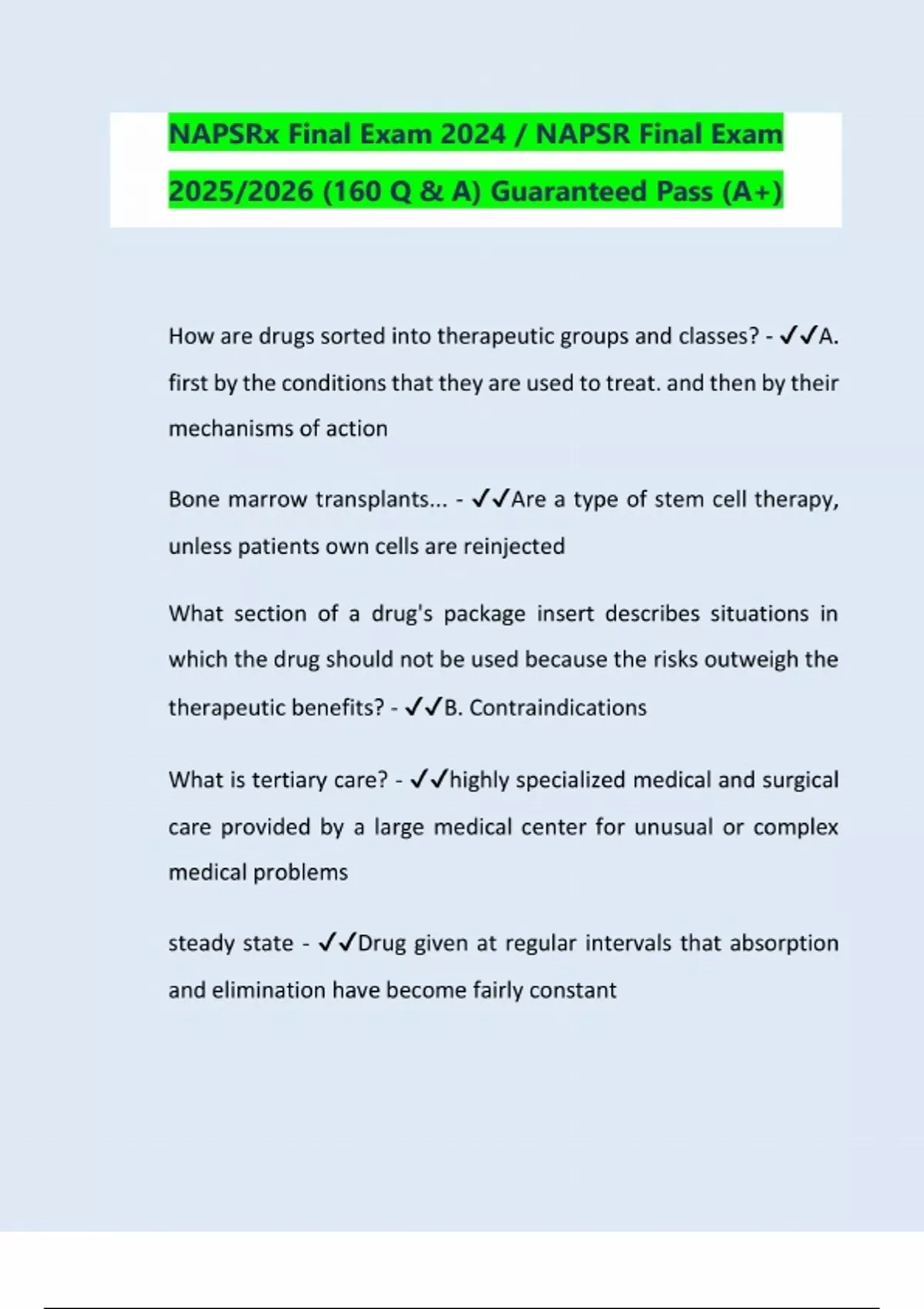 NAPSRx Final Exam 2024 / NAPSR Final Exam 2025/2026 (160 Q & A) Guaranteed Pass (A+) How are drugs sorted into therapeutic groups and classes? - A. first by the conditions that they are used to treat. and then by their mechanisms of action Bone marrow transplants... - Are a type of stem cell therapy, unless patients own cells are reinjected What section of a drug's package insert describes situations in which the drug should not be used because the risks outweigh the therapeutic benefits? - B. Contraindications What is tertiary care? - highly specialized medical and surgical care provided by a large medical center for unusual or complex medical problems steady state - Drug given at regular intervals that absorption and elimination have become fairly constantWhat does it mean if two drugs are at parity - Both drugs are essentially in a neutral position Who is most likely to benefit from electronic sampling programs - Everyone would benefit equall
