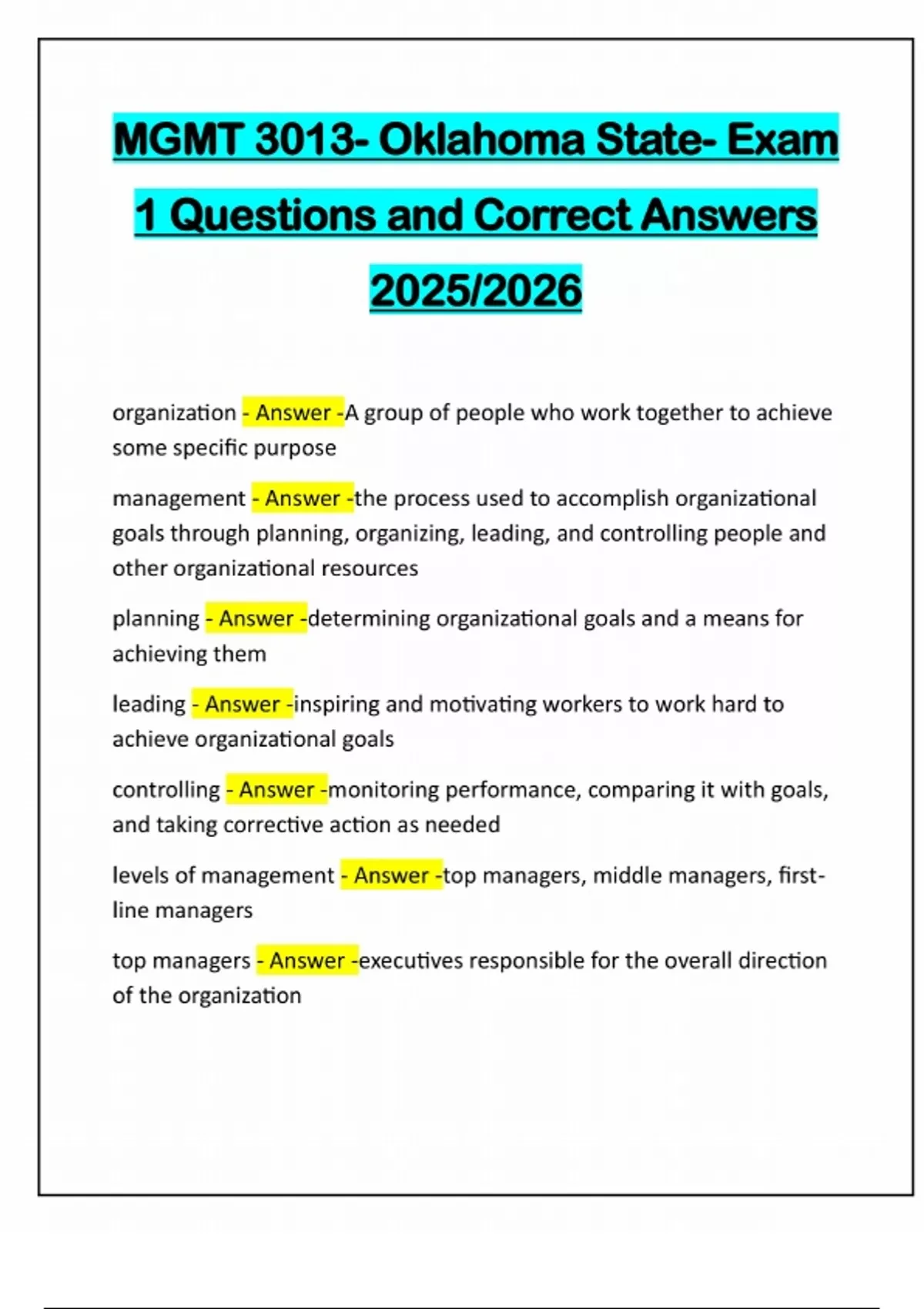 MGMT 3013- Oklahoma State- Exam 1 Questions and Correct Answers 2025/2026 organization - Answer -A group of people who work together to achieve some specific purpose management - Answer -the process used to accomplish organizational goals through planning, organizing, leading, and controlling people and other organizational resources planning - Answer -determining organizational goals and a means for achieving them leading - Answer -inspiring and motivating workers to work hard to achieve organizational goals controlling - Answer -monitoring performance, comparing it with goals, and taking corrective action as needed levels of management - Answer -top managers, middle managers, firstline managers top managers - Answer -executives responsible for the overall direction of the organizationMiddle Managers - Answer -implement the policies and plans of the top managers above them and supervise and coordinate the activities of the first-line managers below them frontline managers - Answer -lower-level managers who supervise the operational activities of the organization conceptual skills - Answer -the ability to analyze and diagnose a