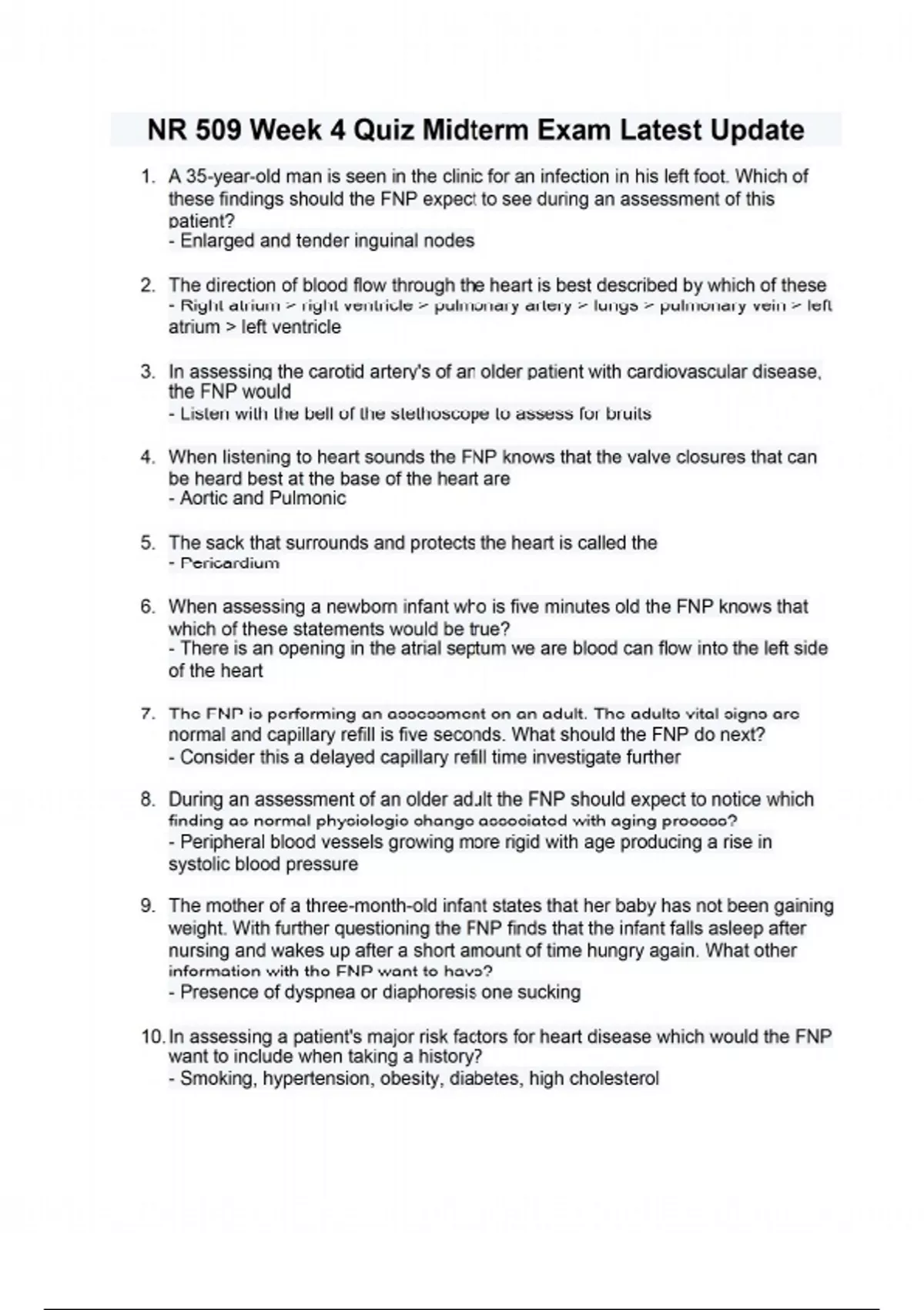 1. A 35-year-old man is seen in the clinic for an infection in his left foot. Which of these findings should the FNP expect to see during an assessment of this patient? - Enlarged and tender inguinal nodes 2. The direction of blood flow through the heart is best described by which of these - Right atrium right ventricle pulmonary artery lungs pulmonary vein left atrium left ventricle 3. In assessing the carotid artery's of an older patient with cardiovascular disease, the FNP would - Listen with the bell of the stethoscope to assess for bruits 4. When listening to heart sounds the FNP knows that the valve closures that can be heard best at the base of the heart are - Aortic and Pulmonic 5. The sack that surrounds and protects the heart is called the - Pericardium 6. When assessing a newborn infant who is five minutes old the FNP knows that which of these statements would be true? - There is an opening in the atrial septum we are blood can flow into the left side of the heart 7. The FNP is performing an assessment on an adult. The adults vital signs are normal and capillary refill is five seconds. What should the FNP do next? - Consider this a delayed capillary refill time investigate further 8. During an assessment of an older adult the FNP should expect to notice which finding as normal physiologic change associated with aging process? - Peripheral blood vessels growing more rigid with age producing a rise in systolic blood pressure 9. The mother of a three-month-old infant states that her baby has not been gaining weight. With further questioning the FNP finds that the infant falls asleep after nursing and wakes up after a short amount of time hungry again. What other information with the FNP want to have? - Presence of dyspnea or diaphoresis one sucking 10. In assessing a patient's major risk factors for heart disease which would the FNP want to include when taking a history? - Smoking, hypertension, obesity, diabetes, high cholesterol 11. The FNP is assessing the pulses of a patient who has been admitted for untreated hyperthyroidism. The FNP should expect to find a____pulse - Bounding 12. A patient complains of leg pain that wakes him at night. He states that he has been having problems with his legs. He has pain in his legs when they are elevated and disappears when he dangles them. He recently noticed a sore on the inner aspect of his right ankle. On the basis of this history information the FNP interprets that the patient is most likely experiencing - Problems related to arterial insufficiency 13. During an assessment the FNP uses the profile sign to detect - Early clubbing 14. Which of these statements describes the closure of the valves in a normal cardiac cycle? - The tricuspid valve closes slightly later than the mitral valve 15. When performing a peripheral vascular assessment on a patient the FNP is unable to palpate the ulnar pulses. The patient skin is warm and capillary refill is normal. The FNP should next - Consider this a normal finding and proceed with the peripheral vascular evaluation 16. A 67-year-old patient states that he "recently began have pain in his left calf when climbing the 10 stairs to his apartment". This pain is relieved by sitting for about two minutes then he's able to resume activities. The FNP interprets this patient is most likely experiencing - Claudication 17. In assessing a 70-year-old man the FNP finds the following blood pressure 140/100 mmHg, heart rate 104 and slightly irregular, split S2. Which of these findings can be explained by expected hemodynamic changes related to age? - Increase in systolic blood pressure 18. The FNP is examining the lymphatic system of a healthy three-year-old child. Which finding should the FNP expect? - The presence of probable lymph nodes 19. The FNP is preparing to perform modified Allen test. Which is an appropriate reason for this test? - To evaluate the adequacy of collateral circulation before cannulating the radial artery 20. A 25-year-old woman is in her fifth month of pregnancy has a blood pressure of 100/70 mmHg. In reviewing her previous exam, the FNP notes that her blood pressure in her second month was 124/80 mmHg. When evaluating this change what does the FNP know to be true? - This is the result of peripheral vasodilation and is an expected change 21. Findings from an assessment of a 70-year-old patient with swelling in his ankles include jugular venous pulsations, 5 cm above the sternal angle when the head of his bed is elevated 45°. The FNP knows that this finding indicate: - Elevated pressure related to heart failure 22. The component of the conduction system referred to as the pacemaker of the heart is the - Sinoatrial (SA) node 23. The FNP is reviewing anatomy and physiology of the heart. Which statement best describes what is meant by atrial kick? - The atria contract toward the end of diastole and push the remaining blood into the ventricles 24. A 45-year-old man is in the clinic for a routine physical. During history the patient states he has been having difficulty sleeping. I'll be sleeping great and then I wake up and feel like I can't catch my breath. The FNP's best response to this would be - Do you have any history of problems with your heart 25. When assessing a patient, the FNP notes that the left femoral pulse as diminished 1+/4+. What should the FNP do next? - Auscultate the site for a bruit