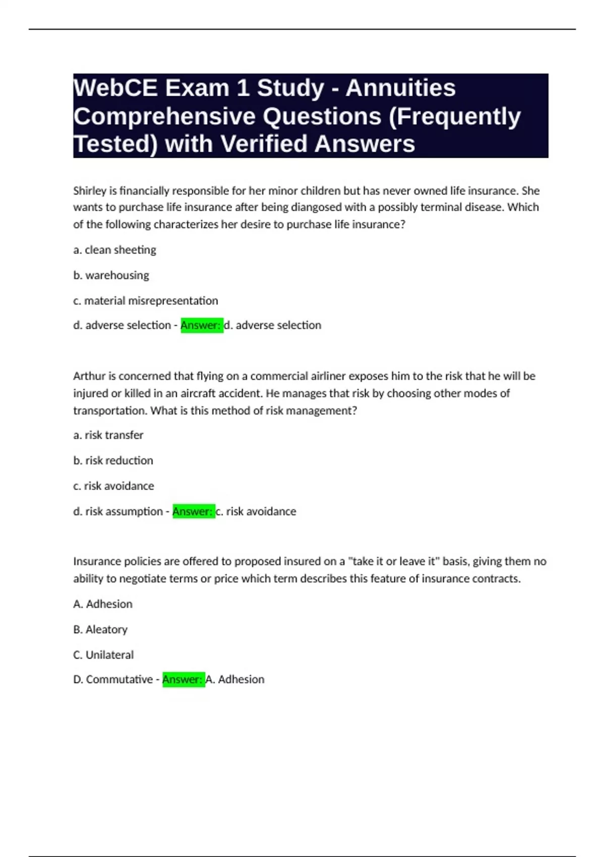 WebCE Exam 1 Study - Annuities Comprehensive Questions (Frequently Tested) with Verified Answers