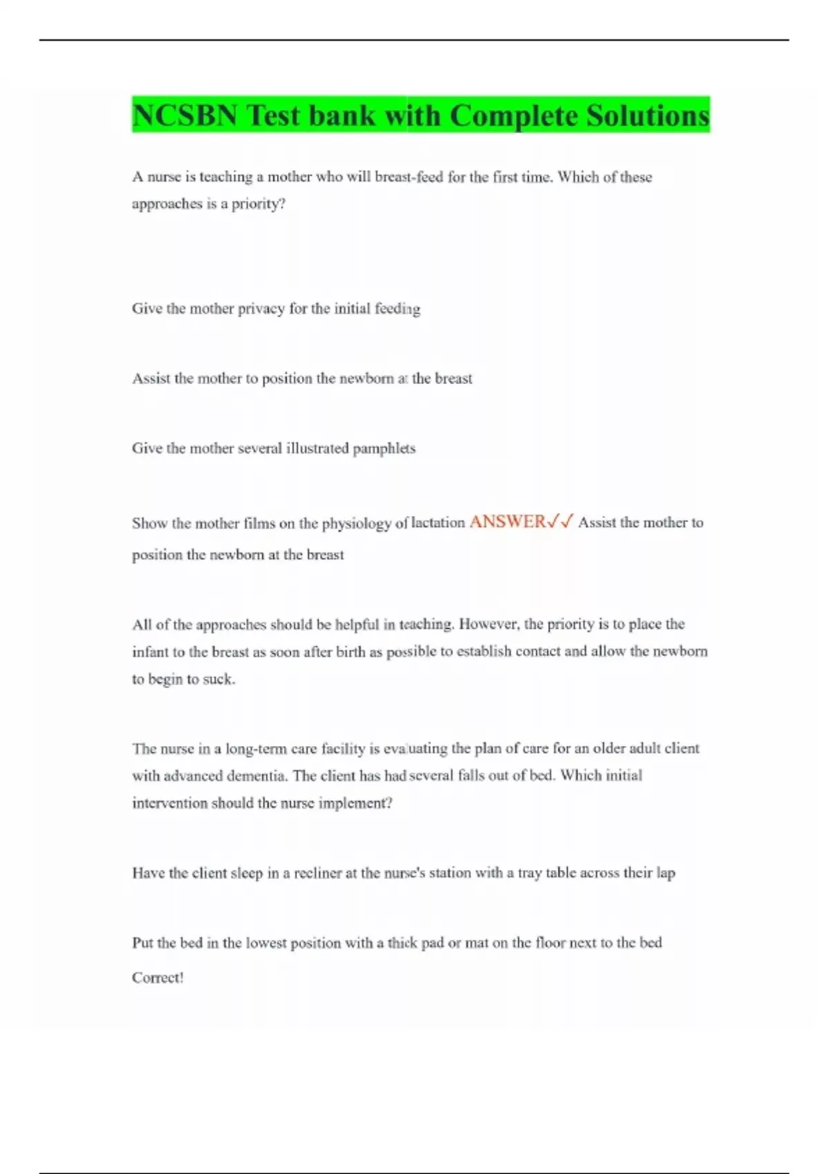 NCSBN Test bank with Complete Solutions A nurse is teaching a mother who will breast-feed for the first time. Which of these approaches is a priority? Give the mother privacy for the initial feeding Assist the mother to position the newborn at the breast Give the mother several illustrated pamphlets Show the mother films on the physiology of lactation ANSWER Assist the mother to position the newborn at the breast All of the approaches should be helpful in teaching. However, the priority is to place the infant to the breast as soon after birth as possible to establish contact and allow the newborn to begin to suck. The nurse in a long-term care facility is evaluating the plan of care for an older adult client with advanced dementia. The client has had several falls out of bed. Which initial intervention should the nurse implement? Have the client sleep in a recliner at the nurse's station with a tray table across their lap Put the bed in the lowest position with a thick pad or mat on the floor next to the bed Correct!