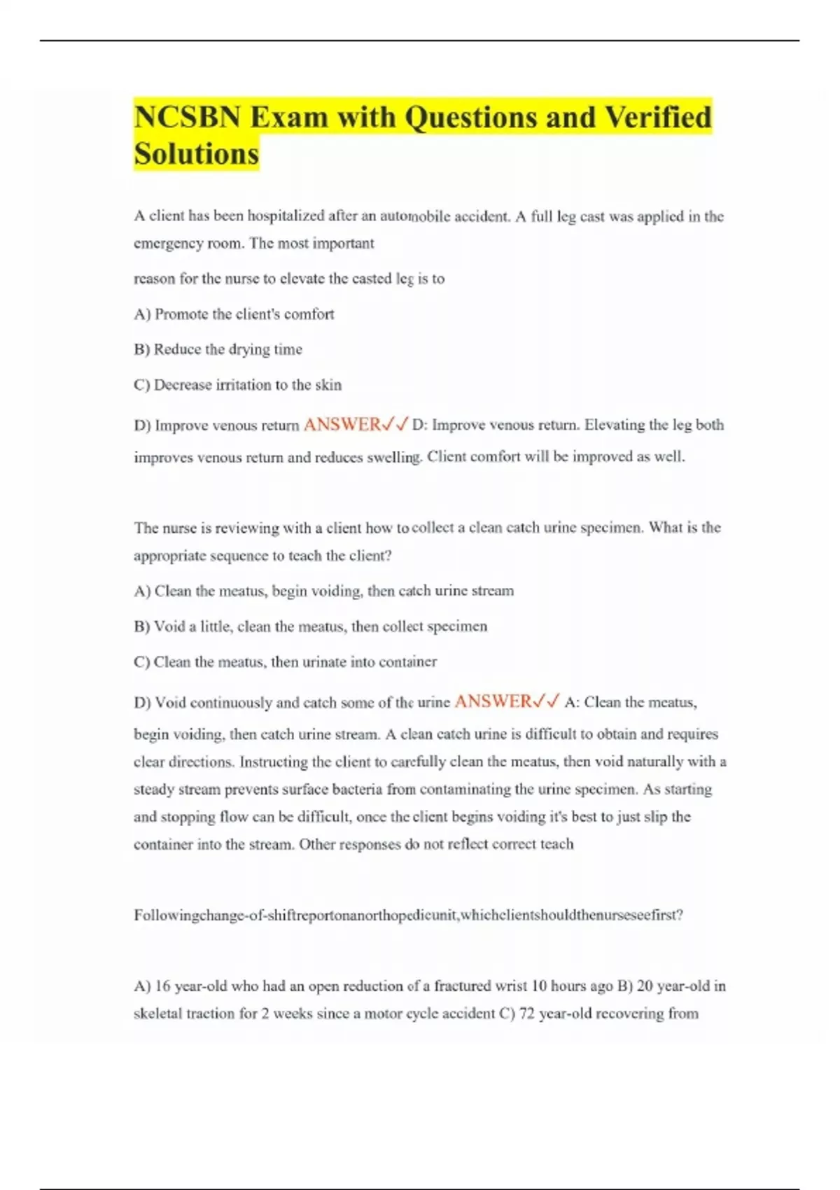 NCSBN Exam with Questions and Verified Solutions A client has been hospitalized after an automobile accident. A full leg cast was applied in the emergency room. The most important reason for the nurse to elevate the casted leg is to A) Promote the client's comfort B) Reduce the drying time C) Decrease irritation to the skin D) Improve venous return ANSWER D: Improve venous return. Elevating the leg both improves venous return and reduces swelling. Client comfort will be improved as well. The nurse is reviewing with a client how to collect a clean catch urine specimen. What is the appropriate sequence to teach the client? A) Clean the meatus, begin voiding, then catch urine stream B) Void a little, clean the meatus, then collect specimen C) Clean the meatus, then urinate into container D) Void continuously and catch some of the urine ANSWER A: Clean the meatus, begin voiding, then catch urine stream. A clean catch urine is difficult to obtain and requires clear directions. Instructing the client to carefully clean the meatus, then void naturally with a steady stream prevents surface bacteria from contaminating the urine specimen. As starting and stopping flow can be difficult, once the client begins voiding it's best to just slip the container into the stream. Other responses do not reflect correct teach Followingchange-of-shiftreportonanorthopedicunit,whichclientshouldthenurseseefirst? A) 16 year-old who had an open reduction of a fractured wrist 10 hours ago B) 20 year-old in skeletal traction for 2 weeks since a motor cycle accident C) 72 year-old recovering from