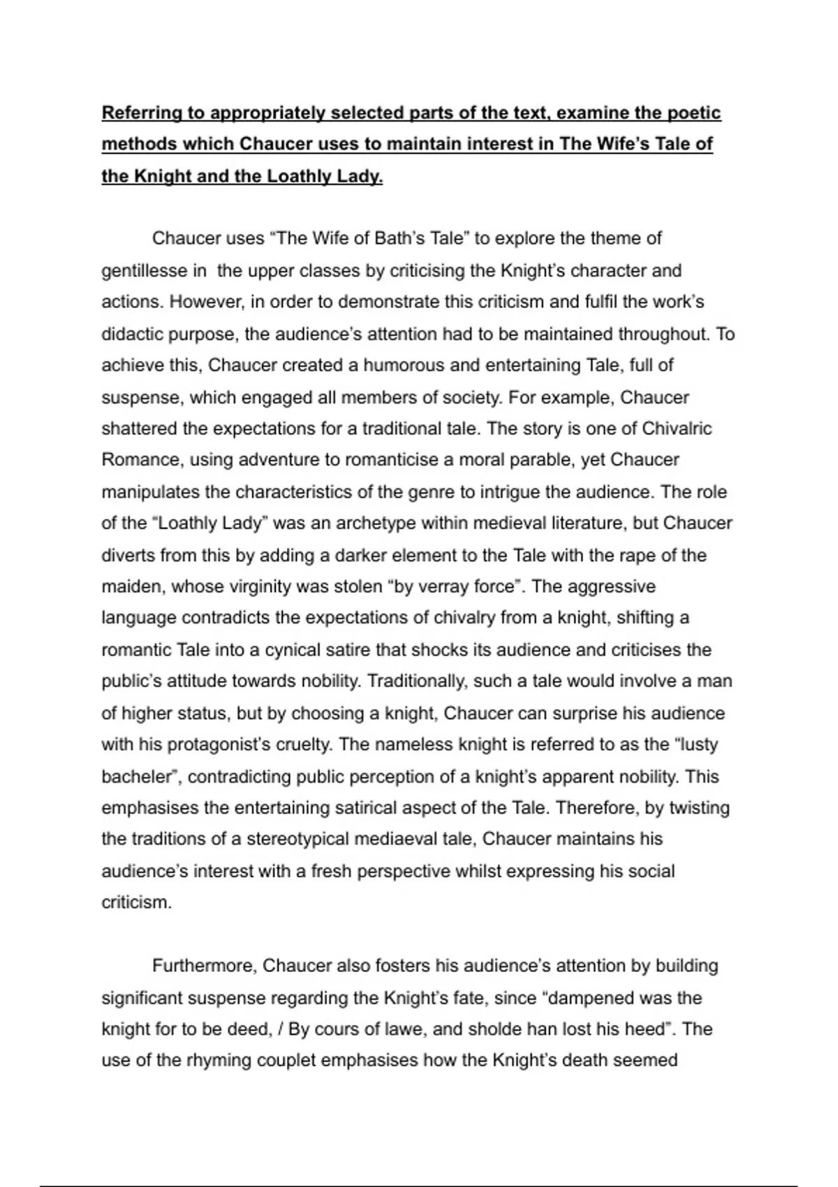 "Referring to appropriately selected parts of the text, examine the poetic methods which Chaucer uses to maintain interest in The Wife’s Tale of the Knight and the Loathly Lady." This is an essay for "The Wife of Bath's Prologue and Tale" for A Level English Literature. Happy studying!
