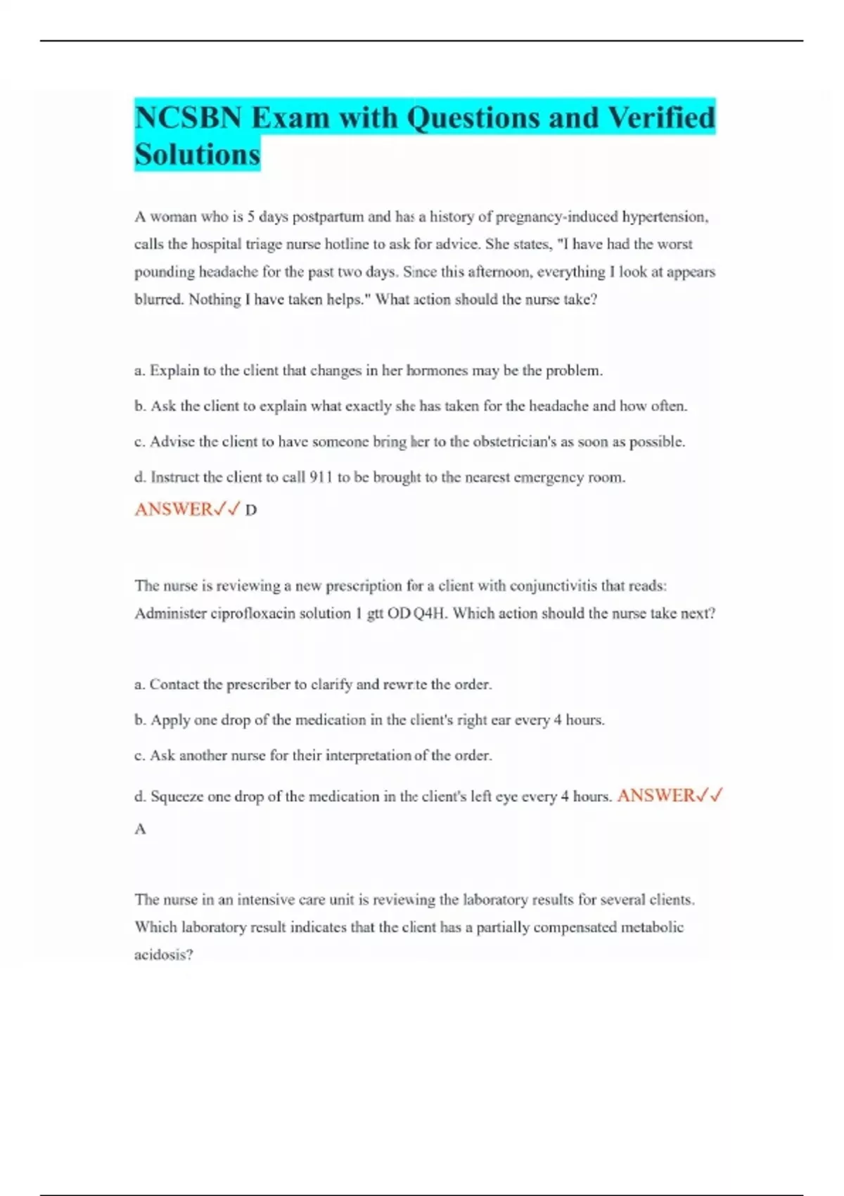 NCSBN Exam with Questions and Verified Solutions A woman who is 5 days postpartum and has a history of pregnancy-induced hypertension, calls the hospital triage nurse hotline to ask for advice. She states, "I have had the worst pounding headache for the past two days. Since this afternoon, everything I look at appears blurred. Nothing I have taken helps." What action should the nurse take? a. Explain to the client that changes in her hormones may be the problem. b. Ask the client to explain what exactly she has taken for the headache and how often. c. Advise the client to have someone bring her to the obstetrician's as soon as possible. d. Instruct the client to call 911 to be brought to the nearest emergency room. ANSWER D The nurse is reviewing a new prescription for a client with conjunctivitis that reads: Administer ciprofloxacin solution 1 gtt OD Q4H. Which action should the nurse take next? a. Contact the prescriber to clarify and rewrite the order. b. Apply one drop of the medication in the client's right ear every 4 hours. c. Ask another nurse for their interpretation of the order. d. Squeeze one drop of the medication in the client's left eye every 4 hours. ANSWER A The nurse in an intensive care unit is reviewing the laboratory results for several clients. Which laboratory result indicates that the client has a partially compensated metabolic acidosis?