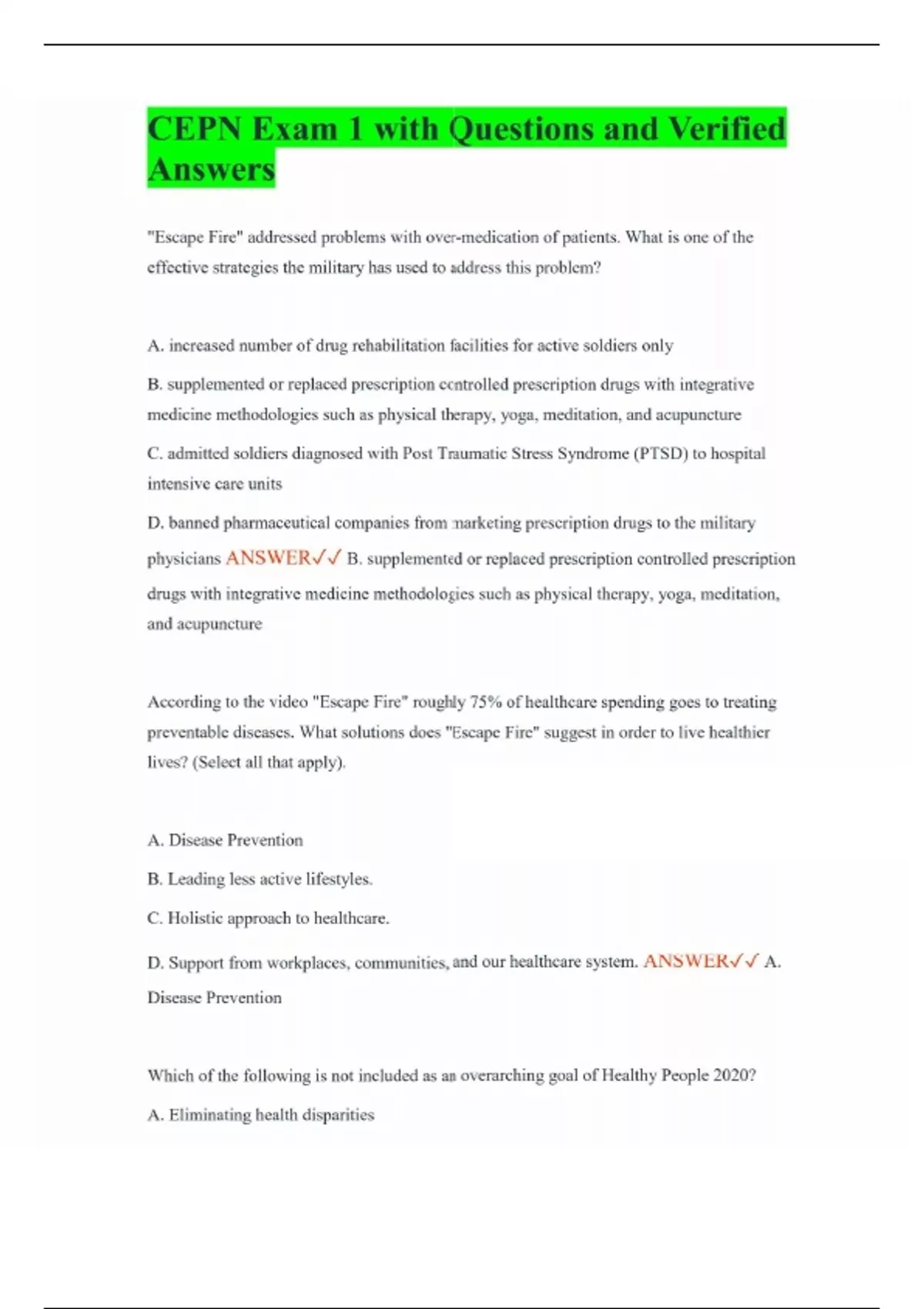 CEPN Exam 1 with Questions and Verified Answers "Escape Fire" addressed problems with over-medication of patients. What is one of the effective strategies the military has used to address this problem? A. increased number of drug rehabilitation facilities for active soldiers only B. supplemented or replaced prescription controlled prescription drugs with integrative medicine methodologies such as physical therapy, yoga, meditation, and acupuncture C. admitted soldiers diagnosed with Post Traumatic Stress Syndrome (PTSD) to hospital intensive care units D. banned pharmaceutical companies from marketing prescription drugs to the military physicians ANSWER B. supplemented or replaced prescription controlled prescription drugs with integrative medicine methodologies such as physical therapy, yoga, meditation, and acupuncture According to the video "Escape Fire" roughly 75% of healthcare spending goes to treating preventable diseases. What solutions does "Escape Fire" suggest in order to live healthier lives? (Select all that apply). A. Disease Prevention B. Leading less active lifestyles. C. Holistic approach to healthcare. D. Support from workplaces, communities, and our healthcare system. ANSWER A. Disease Prevention Which of the following is not included as an overarching goal of Healthy People 2020? A. Eliminating health disparities