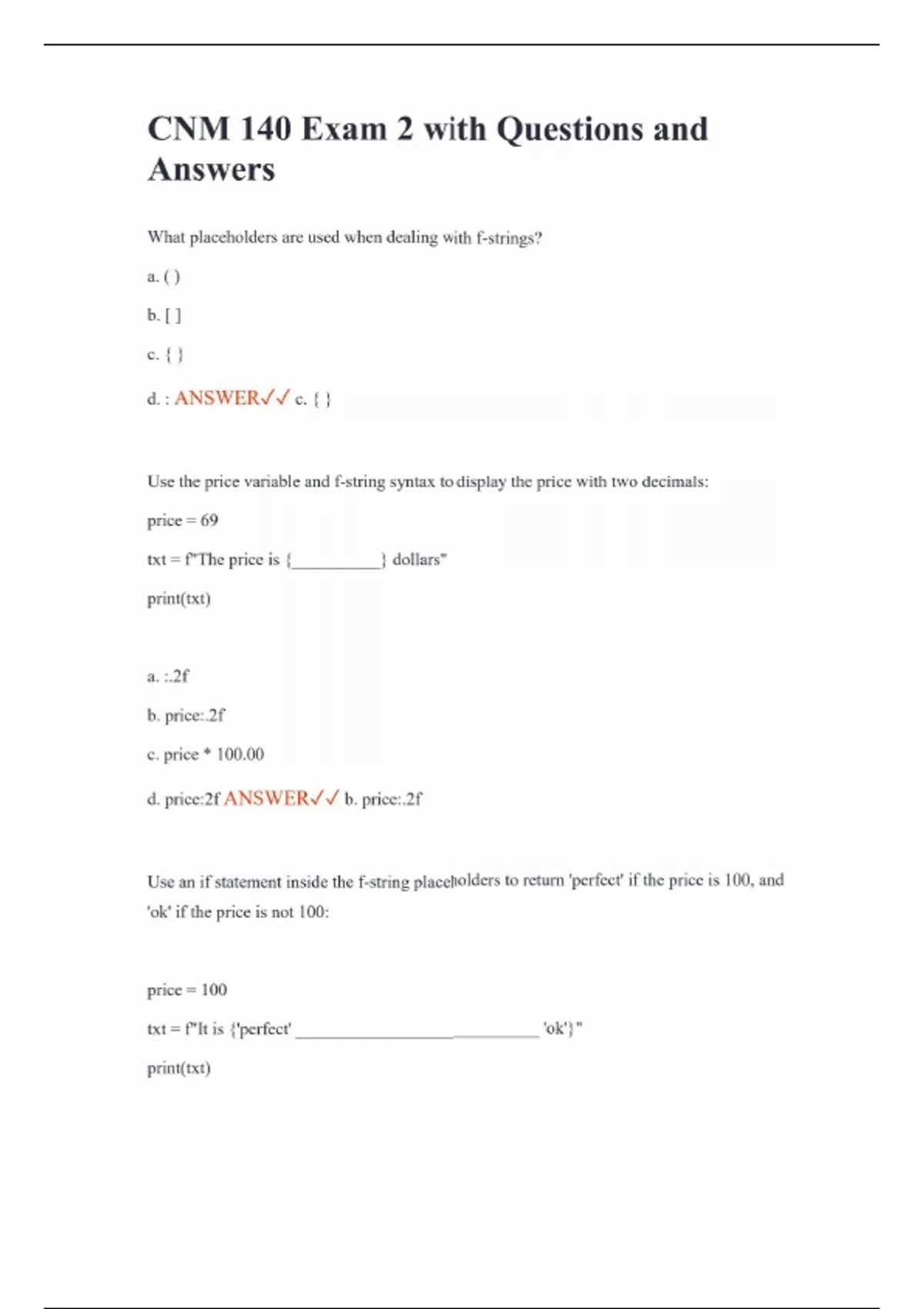 CNM 140 Exam 2 with Questions and Answers What placeholders are used when dealing with f-strings? a. ( ) b. [ ] c. { } d. : ANSWER c. { } Use the price variable and f-string syntax to display the price with two decimals: price = 69 txt = f"The price is {__________} dollars" print(txt) a. :.2f b. price:.2f c. price * 100.00 d. price:2f ANSWER b. price:.2f Use an if statement inside the f-string placeholders to return 'perfect' if the price is 100, and 'ok' if the price is not 100: price = 100 txt = f"It is {'perfect' ____________________________ 'ok'}" print(txt)