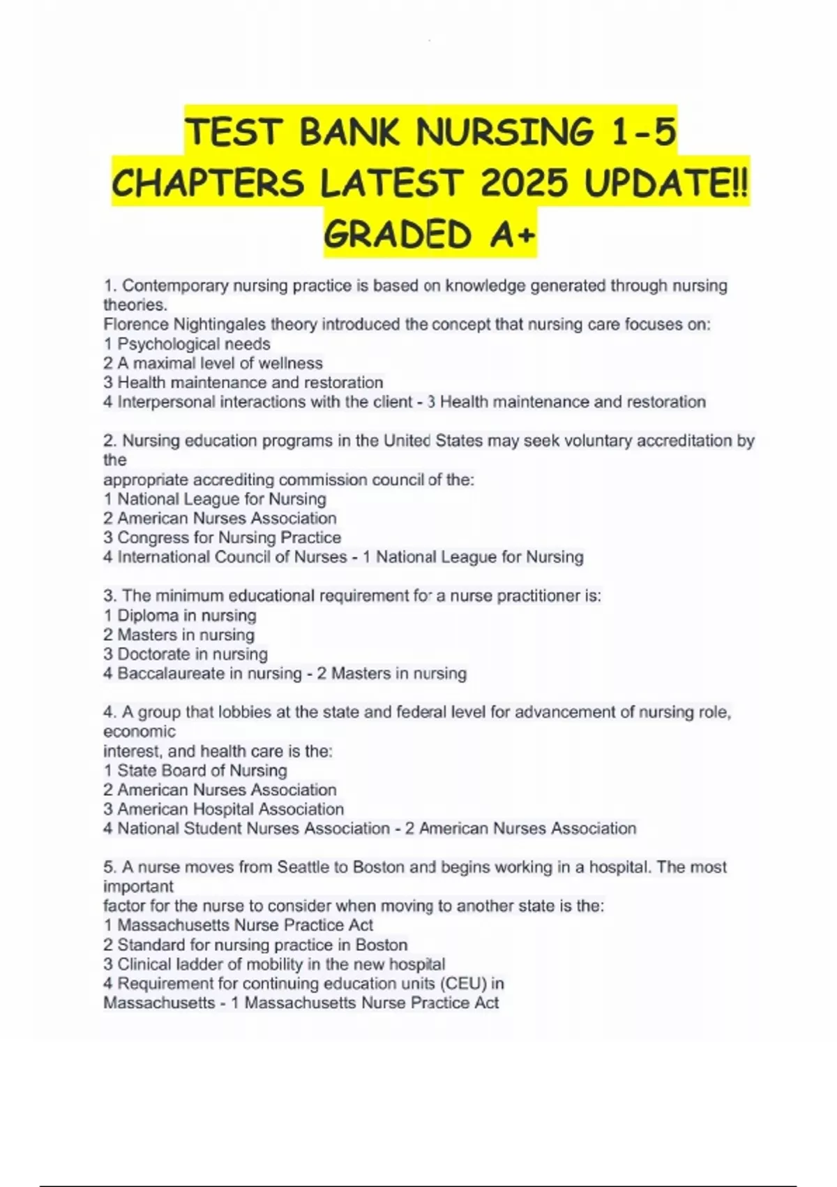 TEST BANK NURSING 1-5 CHAPTERS LATEST 2025 UPDATE!! GRADED A+ TEST BANK NURSING 1-5 CHAPTERS LATEST 2025 UPDATE!! GRADED A+