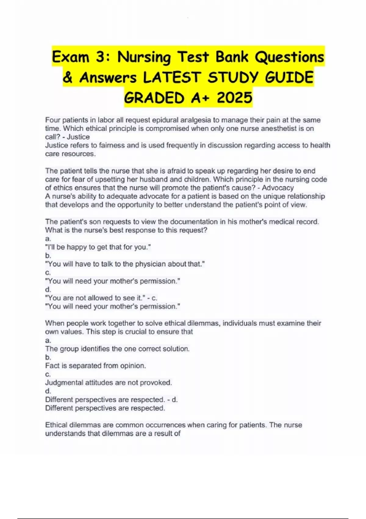Exam 3- Nursing Test Bank Questions & Answers LATEST STUDY GUIDE GRADED A+ 2025 Exam 3- Nursing Test Bank Questions & Answers LATEST STUDY GUIDE GRADED A+ 2025