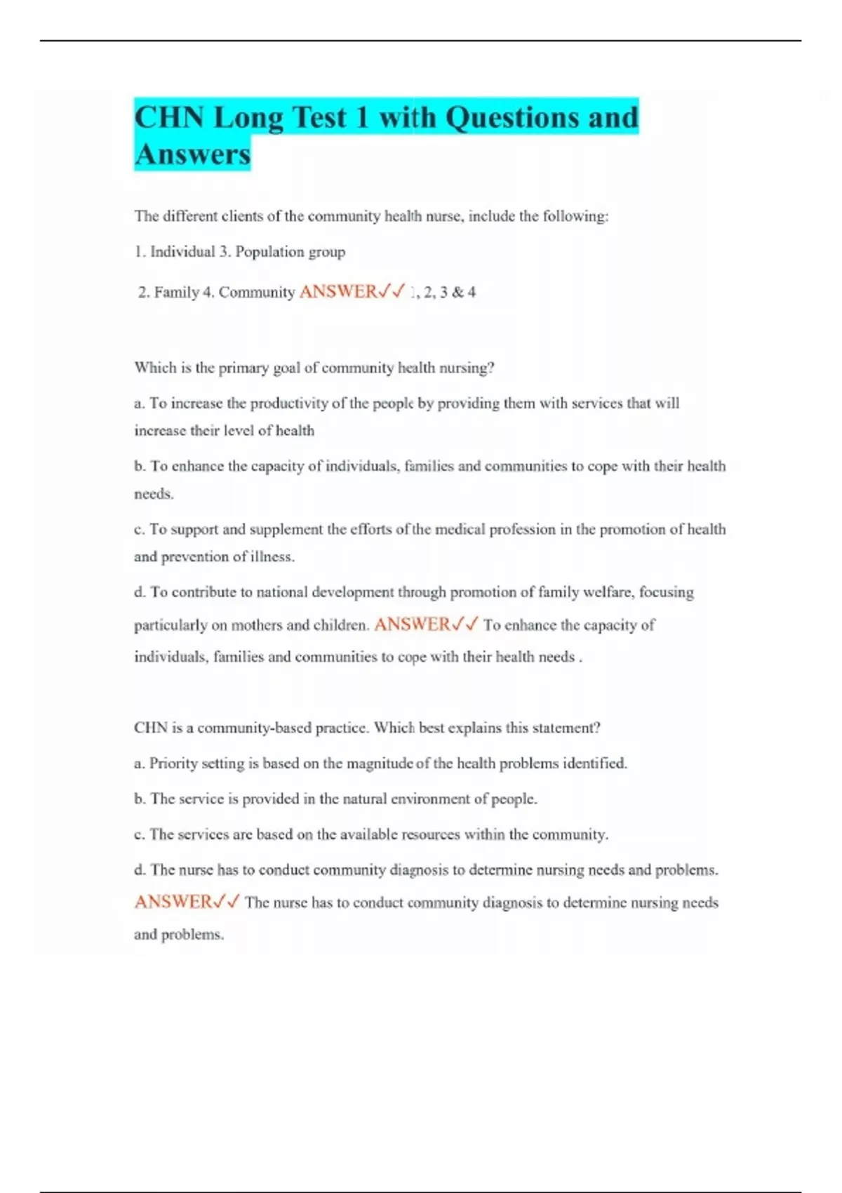 CHN Long Test 1 with Questions and Answers The different clients of the community health nurse, include the following: 1. Individual 3. Population group 2. Family 4. Community ANSWER 1, 2, 3 & 4 Which is the primary goal of community health nursing? a. To increase the productivity of the people by providing them with services that will increase their level of health b. To enhance the capacity of individuals, families and communities to cope with their health needs. c. To support and supplement the efforts of the medical profession in the promotion of health and prevention of illness. d. To contribute to national development through promotion of family welfare, focusing particularly on mothers and children. ANSWER To enhance the capacity of individuals, families and communities to cope with their health needs . CHN is a community-based practice. Which best explains this statement? a. Priority setting is based on the magnitude of the health problems identified. b. The service is provided in the natural environment of people. c. The services are based on the available resources within the community. d. The nurse has to conduct community diagnosis to determine nursing needs and problems. ANSWER The nurse has to conduct community diagnosis to determine nursing needs and problems.