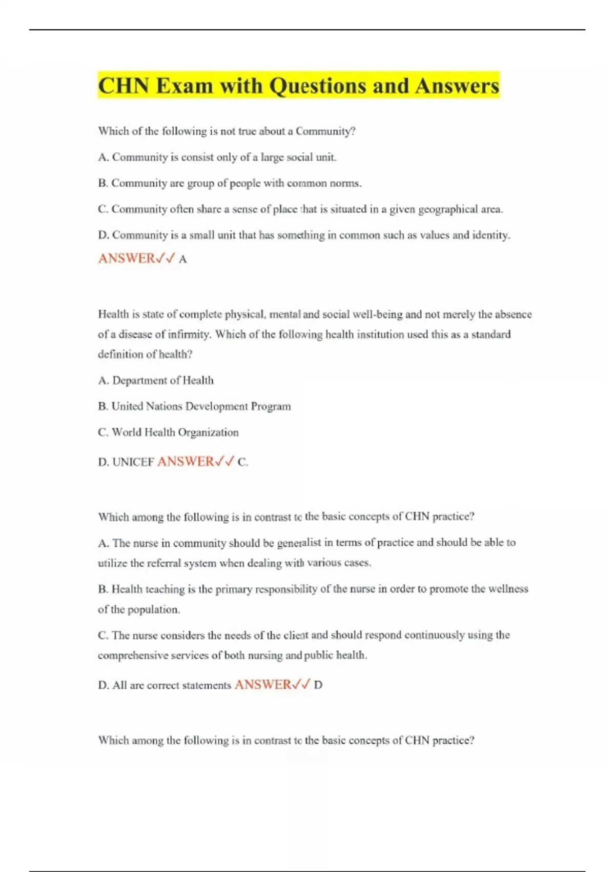 CHN Exam with Questions and Answers Which of the following is not true about a Community? A. Community is consist only of a large social unit. B. Community are group of people with common norms. C. Community often share a sense of place that is situated in a given geographical area. D. Community is a small unit that has something in common such as values and identity. ANSWER A Health is state of complete physical, mental and social well-being and not merely the absence of a disease of infirmity. Which of the following health institution used this as a standard definition of health? A. Department of Health B. United Nations Development Program C. World Health Organization D. UNICEF ANSWER C. Which among the following is in contrast to the basic concepts of CHN practice? A. The nurse in community should be generalist in terms of practice and should be able to utilize the referral system when dealing with various cases. B. Health teaching is the primary responsibility of the nurse in order to promote the wellness of the population. C. The nurse considers the needs of the client and should respond continuously using the comprehensive services of both nursing and public health. D. All are correct statements ANSWER D Which among the following is in contrast to the basic concepts of CHN practice?