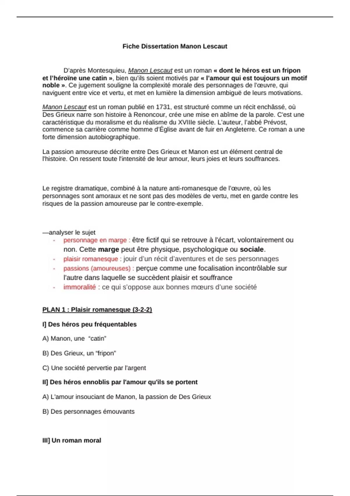Fiche Dissertation Manon Lescaut
