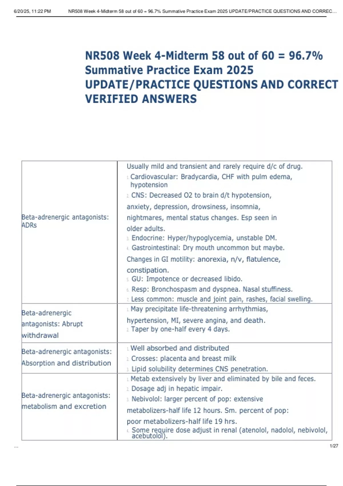 , 6/20/25, 11:22 PM NR508 Week 4-Midterm 58 out of 60 = 96.7% Summative Practice Exam 2025 UPDATE/PRACTICE QUESTIONS AND CORREC…