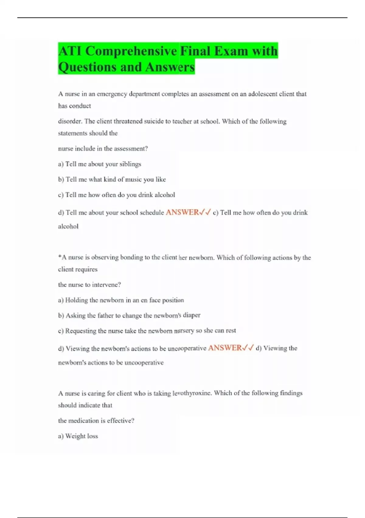 ATI Comprehensive Final Exam with Questions and Answers A nurse in an emergency department completes an assessment on an adolescent client that has conduct disorder. The client threatened suicide to teacher at school. Which of the following statements should the nurse include in the assessment? a) Tell me about your siblings b) Tell me what kind of music you like c) Tell me how often do you drink alcohol d) Tell me about your school schedule ANSWER c) Tell me how often do you drink alcohol *A nurse is observing bonding to the client her newborn. Which of following actions by the client requires the nurse to intervene? a) Holding the newborn in an en face position b) Asking the father to change the newborn's diaper c) Requesting the nurse take the newborn nursery so she can rest d) Viewing the newborn's actions to be uncooperative ANSWER d) Viewing the newborn's actions to be uncooperative A nurse is caring for client who is taking levothyroxine. Which of the following findings should indicate that the medication is effective? a) Weight loss