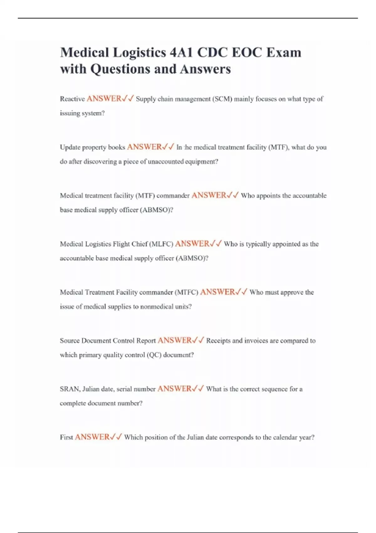 Medical Logistics 4A1 CDC EOC Exam with Questions and Answers Reactive ANSWER Supply chain management (SCM) mainly focuses on what type of issuing system? Update property books ANSWER In the medical treatment facility (MTF), what do you do after discovering a piece of unaccounted equipment? Medical treatment facility (MTF) commander ANSWER Who appoints the accountable base medical supply officer (ABMSO)? Medical Logistics Flight Chief (MLFC) ANSWER Who is typically appointed as the accountable base medical supply officer (ABMSO)? Medical Treatment Facility commander (MTFC) ANSWER Who must approve the issue of medical supplies to nonmedical units? Source Document Control Report ANSWER Receipts and invoices are compared to which primary quality control (QC) document? SRAN, Julian date, serial number ANSWER What is the correct sequence for a complete document number? First ANSWER Which position of the Julian date corresponds to the calendar year?
