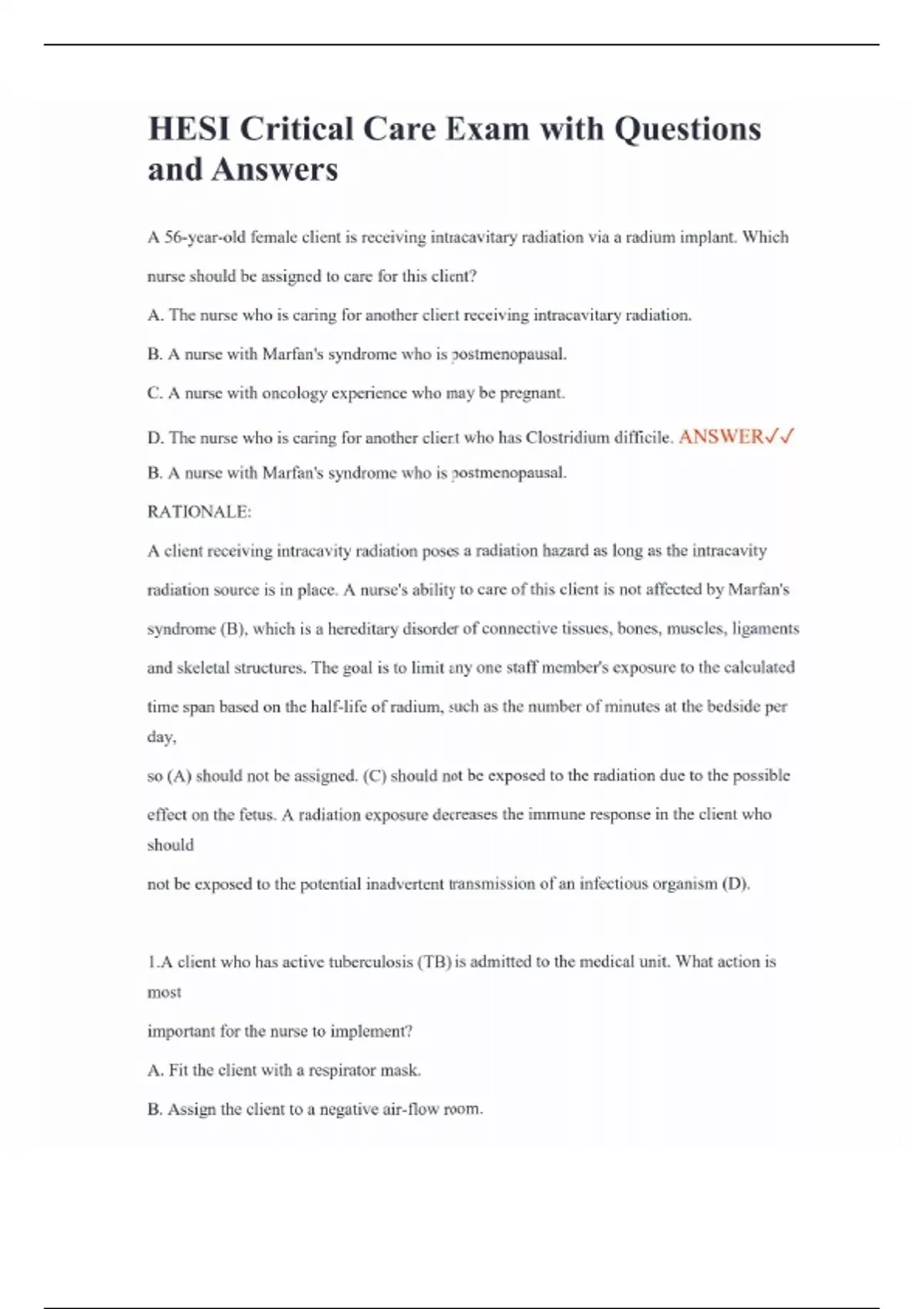 HESI Critical Care Exam with Questions and Answers A 56-year-old female client is receiving intracavitary radiation via a radium implant. Which nurse should be assigned to care for this client? A. The nurse who is caring for another client receiving intracavitary radiation. B. A nurse with Marfan's syndrome who is postmenopausal. C. A nurse with oncology experience who may be pregnant. D. The nurse who is caring for another client who has Clostridium difficile. ANSWER B. A nurse with Marfan's syndrome who is postmenopausal. RATIONALE: A client receiving intracavity radiation poses a radiation hazard as long as the intracavity radiation source is in place. A nurse's ability to care of this client is not affected by Marfan's syndrome (B), which is a hereditary disorder of connective tissues, bones, muscles, ligaments and skeletal structures. The goal is to limit any one staff member's exposure to the calculated time span based on the half-life of radium, such as the number of minutes at the bedside per day, so (A) should not be assigned. (C) should not be exposed to the radiation due to the possible effect on the fetus. A radiation exposure decreases the immune response in the client who should not be exposed to the potential inadvertent transmission of an infectious organism (D). 1.A client who has active tuberculosis (TB) is admitted to the medical unit. What action is most important for the nurse to implement? A. Fit the client with a respirator mask. B. Assign the client to a negative air-flow room.