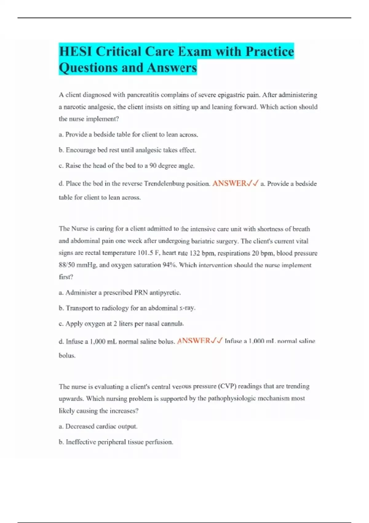 HESI Critical Care Exam with Practice Questions and Answers A client diagnosed with pancreatitis complains of severe epigastric pain. After administering a narcotic analgesic, the client insists on sitting up and leaning forward. Which action should the nurse implement? a. Provide a bedside table for client to lean across. b. Encourage bed rest until analgesic takes effect. c. Raise the head of the bed to a 90 degree angle. d. Place the bed in the reverse Trendelenburg position. ANSWER a. Provide a bedside table for client to lean across. The Nurse is caring for a client admitted to the intensive care unit with shortness of breath and abdominal pain one week after undergoing bariatric surgery. The client's current vital signs are rectal temperature 101.5 F, heart rate 132 bpm, respirations 20 bpm, blood pressure 88/50 mmHg, and oxygen saturation 94%. Which intervention should the nurse implement first? a. Administer a prescribed PRN antipyretic. b. Transport to radiology for an abdominal x-ray. c. Apply oxygen at 2 liters per nasal cannula. d. Infuse a 1,000 mL normal saline bolus. ANSWER Infuse a 1,000 mL normal saline bolus. The nurse is evaluating a client's central venous pressure (CVP) readings that are trending upwards. Which nursing problem is supported by the pathophysiologic mechanism most likely causing the increases? a. Decreased cardiac output. b. Ineffective peripheral tissue perfusion.