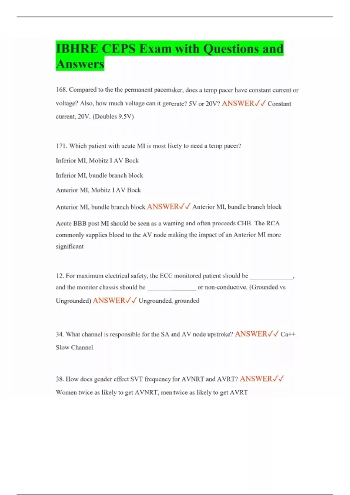 IBHRE CEPS Exam with Questions and Answers 168. Compared to the the permanent pacemaker, does a temp pacer have constant current or voltage? Also, how much voltage can it generate? 5V or 20V? ANSWER Constant current, 20V. (Doubles 9.5V) 171. Which patient with acute MI is most likely to need a temp pacer? Inferior MI, Mobitz I AV Bock Inferior MI, bundle branch block Anterior MI, Mobitz I AV Bock Anterior MI, bundle branch block ANSWER Anterior MI, bundle branch block Acute BBB post MI should be seen as a warning and often proceeds CHB. The RCA commonly supplies blood to the AV node making the impact of an Anterior MI more significant 12. For maximum electrical safety, the ECG monitored patient should be _____________, and the monitor chassis should be _______________ or non-conductive. (Grounded vs Ungrounded) ANSWER Ungrounded, grounded 34. What channel is responsible for the SA and AV node upstroke? ANSWER Ca++ Slow Channel 38. How does gender effect SVT frequency for AVNRT and AVRT? ANSWER Women twice as likely to get AVNRT, men twice as likely to get AVRT