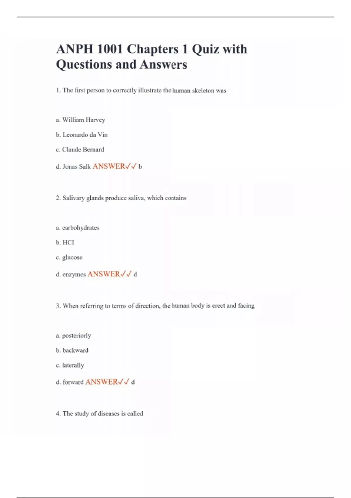 ANPH 1001 Chapters 1 Quiz with Questions and Answers 1. The first person to correctly illustrate the human skeleton was a. William Harvey b. Leonardo da Vin c. Claude Bernard d. Jonas Salk ANSWER b 2. Salivary glands produce saliva, which contains a. carbohydrates b. HCI c. glucose d. enzymes ANSWER d 3. When referring to terms of direction, the human body is erect and facing a. posteriorly b. backward c. laterally d. forward ANSWER d 4. The study of diseases is called