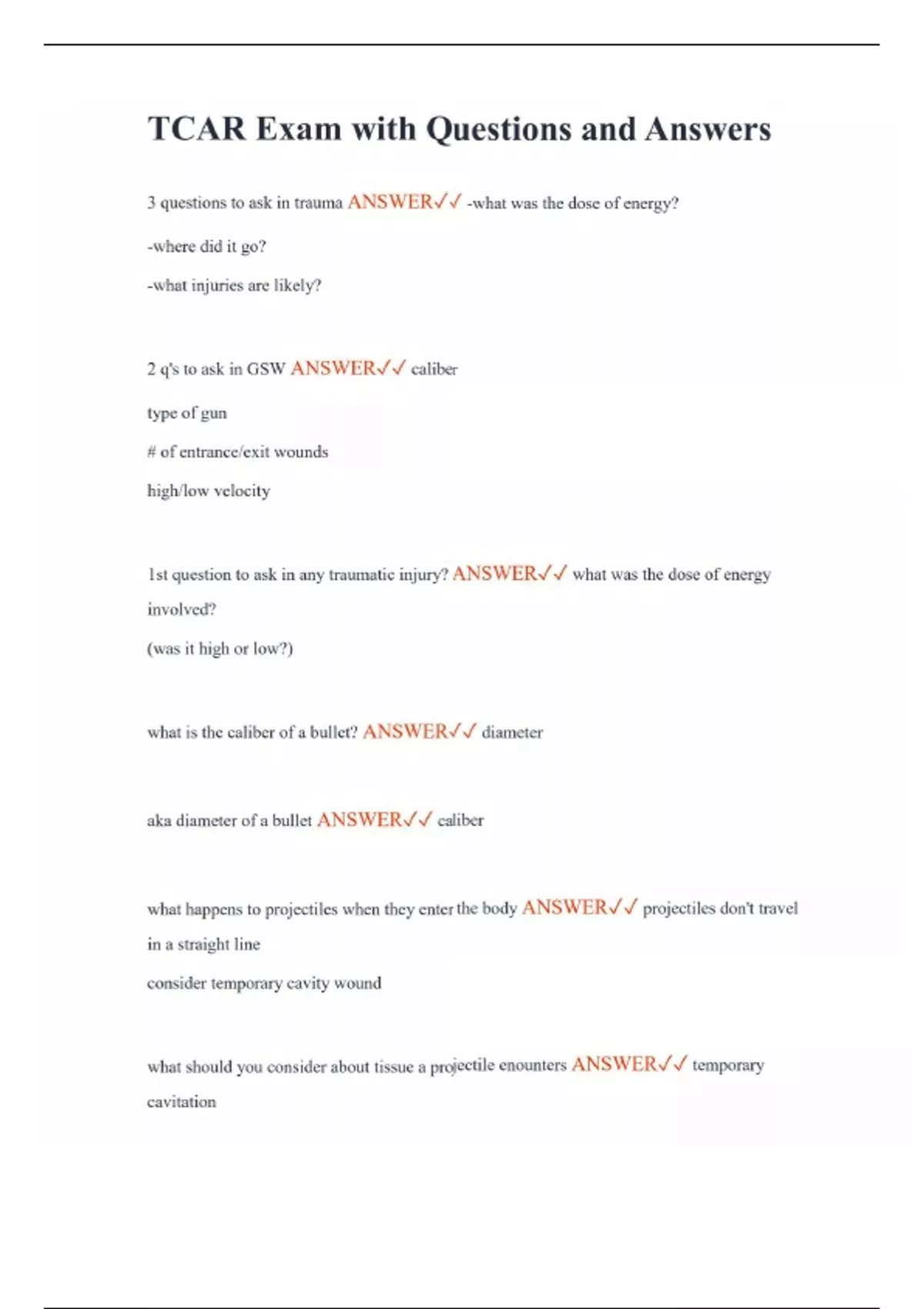 TCAR Exam with Questions and Answers 3 questions to ask in trauma ANSWER -what was the dose of energy? -where did it go? -what injuries are likely? 2 q's to ask in GSW ANSWER caliber type of gun # of entrance/exit wounds high/low velocity 1st question to ask in any traumatic injury? ANSWER what was the dose of energy involved? (was it high or low?) what is the caliber of a bullet? ANSWER diameter aka diameter of a bullet ANSWER caliber what happens to projectiles when they enter the body ANSWER projectiles don't travel in a straight line consider temporary cavity wound what should you consider about tissue a projectile enounters ANSWER temporary cavitation