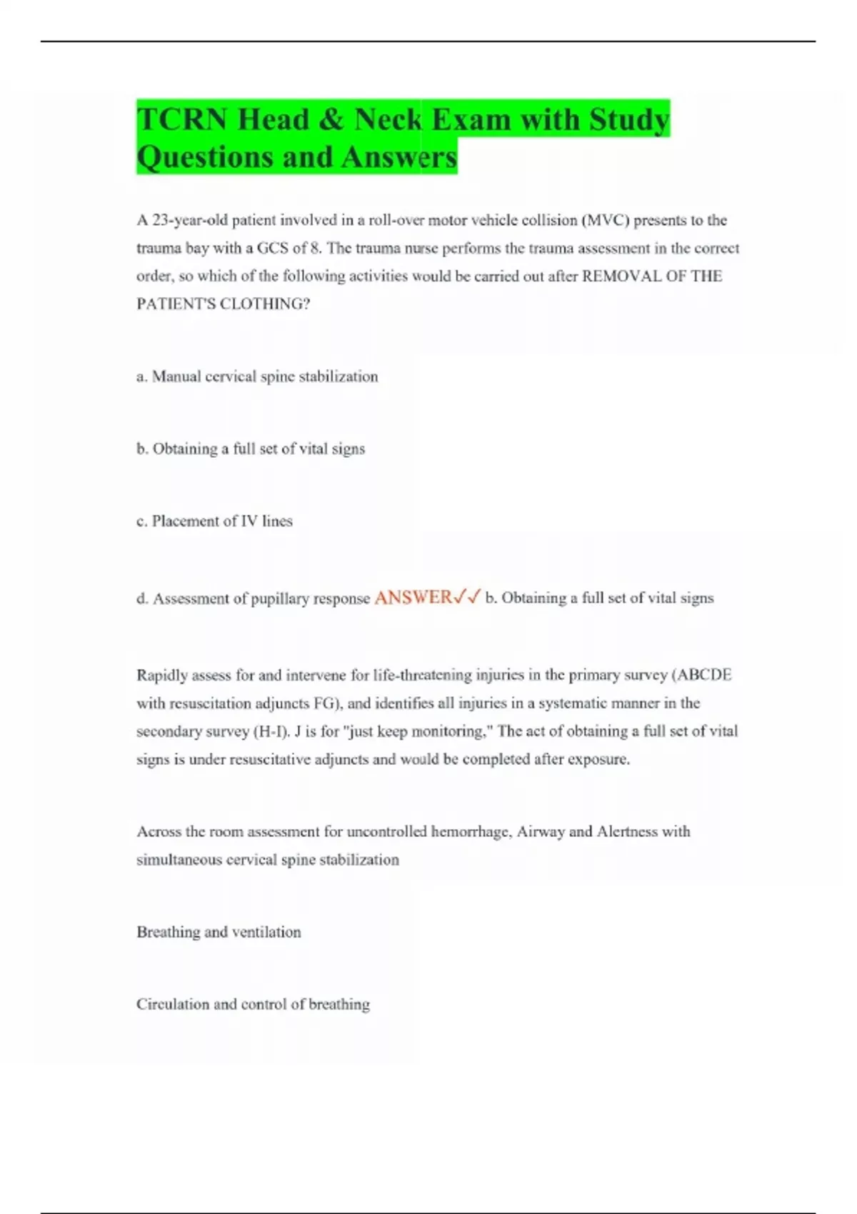 TCRN Head & Neck Exam with Study Questions and Answers A 23-year-old patient involved in a roll-over motor vehicle collision (MVC) presents to the trauma bay with a GCS of 8. The trauma nurse performs the trauma assessment in the correct order, so which of the following activities would be carried out after REMOVAL OF THE PATIENT'S CLOTHING? a. Manual cervical spine stabilization b. Obtaining a full set of vital signs c. Placement of IV lines d. Assessment of pupillary response ANSWER b. Obtaining a full set of vital signs Rapidly assess for and intervene for life-threatening injuries in the primary survey (ABCDE with resuscitation adjuncts FG), and identifies all injuries in a systematic manner in the secondary survey (H-I). J is for "just keep monitoring," The act of obtaining a full set of vital signs is under resuscitative adjuncts and would be completed after exposure. Across the room assessment for uncontrolled hemorrhage, Airway and Alertness with simultaneous cervical spine stabilization Breathing and ventilation Circulation and control of breathing