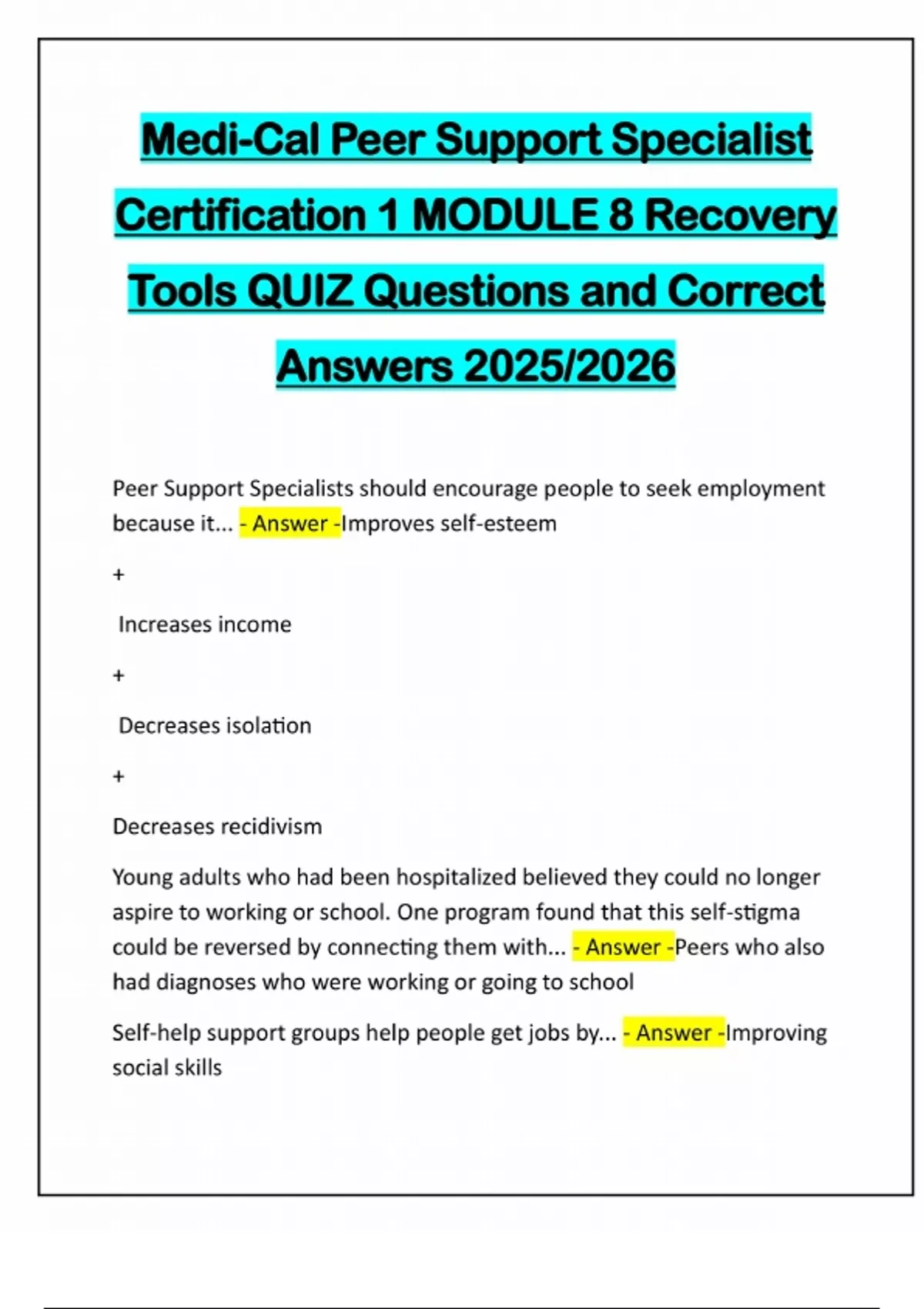 Medi-Cal Peer Support Specialist Certification 1 MODULE 8 Recovery Tools QUIZ Questions and Correct Answers 2025/2026 Peer Support Specialists should encourage people to seek employment because it... - Answer -Improves self-esteem + Increases income + Decreases isolation + Decreases recidivism Young adults who had been hospitalized believed they could no longer aspire to working or school. One program found that this self-stigma could be reversed by connecting them with... - Answer -Peers who also had diagnoses who were working or going to school Self-help support groups help people get jobs by... - Answer -Improving social skills