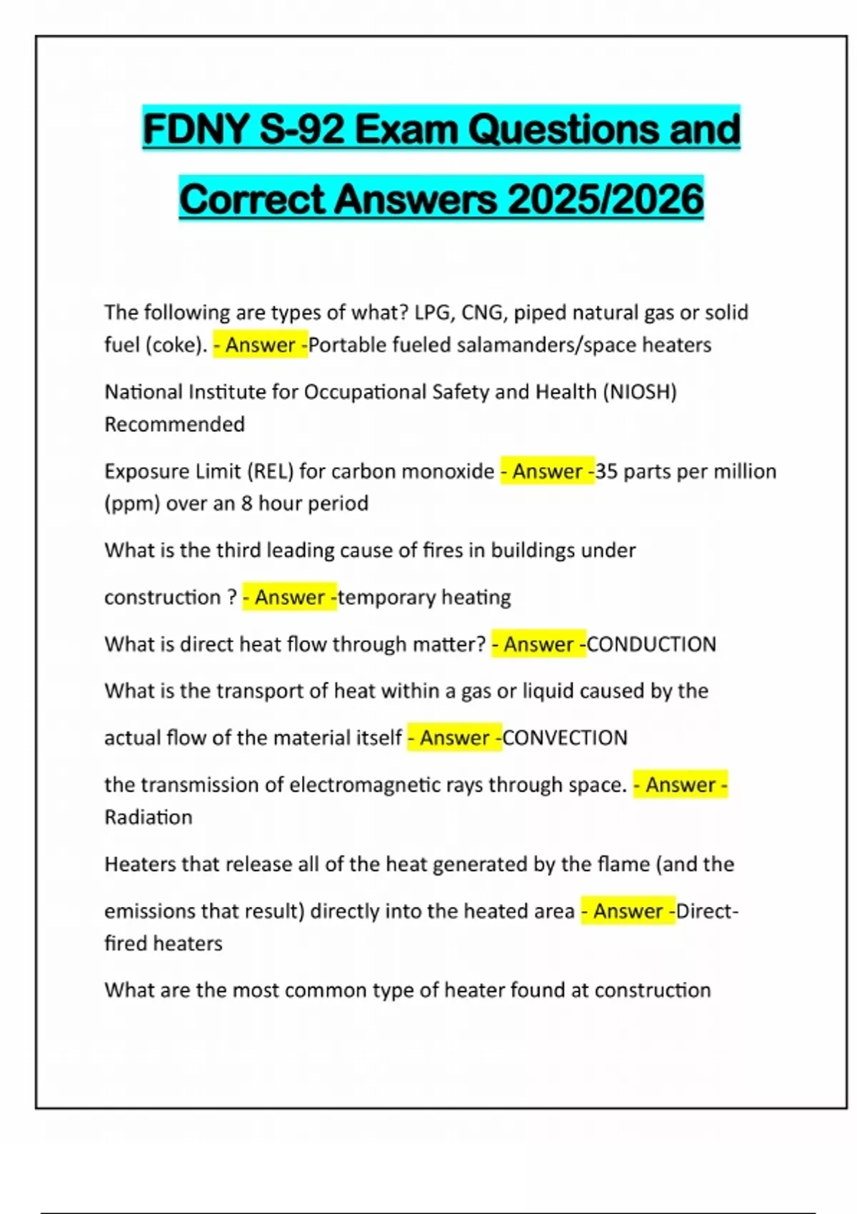 FDNY S-92 Exam Questions and Correct Answers 2025/2026 The following are types of what? LPG, CNG, piped natural gas or solid fuel (coke). - Answer -Portable fueled salamanders/space heaters National Institute for Occupational Safety and Health (NIOSH) Recommended Exposure Limit (REL) for carbon monoxide - Answer -35 parts per million (ppm) over an 8 hour period What is the third leading cause of fires in buildings under construction ? - Answer -temporary heating What is direct heat flow through matter? - Answer -CONDUCTION What is the transport of heat within a gas or liquid caused by the actual flow of the material itself - Answer -CONVECTION the transmission of electromagnetic rays through space. - Answer - Radiation Heaters that release all of the heat generated by the flame (and the emissions that result) directly into the heated area - Answer -Directfired heaters What are the most common type of heater found at constructionsites? - Answer -Direct-fired heaters The flame of this heater is enclosed in a heat exchanger that separates combustion products from the air to be heated. - Answer -Indirect-Fired Heaters When may portable oil-fueled space heaters be stored, handled and used at construction sites - Answer -only during the heating season (October 15th - May 30th). A fail-safe system or other approved device, equipment or system designed to shut off flow caused by a rupture in a pressurized piping system. - Answer -EXCESS FLOW CONTROL A liquefied compressed gas which, under a charged pressure, is partially liquid at a temperature of 68°F (20°C) and which is a flammable gas. - Answer -FLAMMABLE LIQUEFIED GAS supervision by the holder of any department certificate who is responsible but need not be personally present on the premises at all times - Answer -GENERAL SUPERVISION A material having a melting point that is equal to or less than 68°F (20°C) and a boiling point that is greater than 68°F (20°C) at