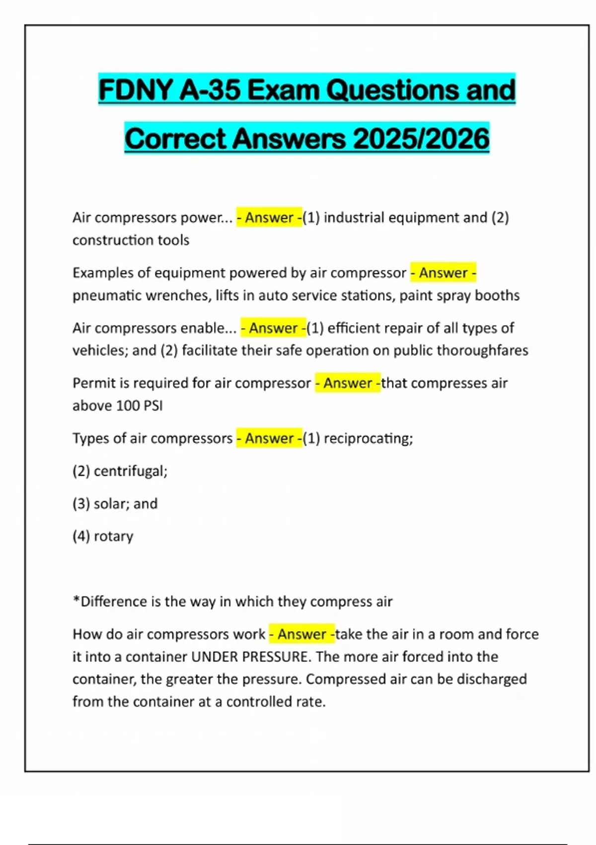 FDNY A-35 Exam Questions and Correct Answers 2025/2026 Air compressors power... - Answer -(1) industrial equipment and (2) construction tools Examples of equipment powered by air compressor - Answer - pneumatic wrenches, lifts in auto service stations, paint spray booths Air compressors enable... - Answer -(1) efficient repair of all types of vehicles; and (2) facilitate their safe operation on public thoroughfares Permit is required for air compressor - Answer -that compresses air above 100 PSI Types of air compressors - Answer -(1) reciprocating; (2) centrifugal; (3) solar; and (4) rotary *Difference is the way in which they compress air How do air compressors work - Answer -take the air in a room and force it into a container UNDER PRESSURE. The more air forced into the container, the greater the pressure. Compressed air can be discharged from the container at a controlled rate.Most common air compressor - Answer -Reciprocating Air compressors are sometimes called - Answer -air pumps Air compressors can be powered by: - Answer -(1) electric motors; (2) internal combustion engines; or (3) steam turbines Explosions & air compressors - Answer -If there is a build up of flammable gases (ex: in service stations and workshops), those gases are heavier than air and fall to the floor before spreading outward
