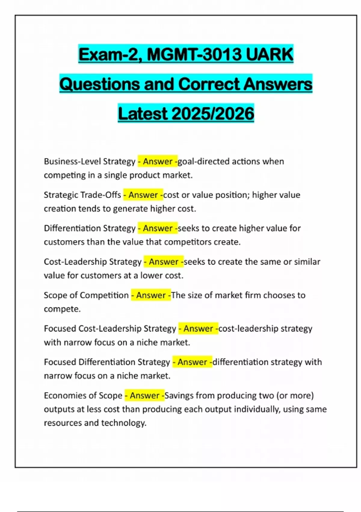 Exam-2, MGMT-3013 UARK Questions and Correct Answers Latest 2025/2026 Business-Level Strategy - Answer -goal-directed actions when competing in a single product market. Strategic Trade-Offs - Answer -cost or value position; higher value creation tends to generate higher cost. Differentiation Strategy - Answer -seeks to create higher value for customers than the value that competitors create. Cost-Leadership Strategy - Answer -seeks to create the same or similar value for customers at a lower cost. Scope of Competition - Answer -The size of market firm chooses to compete. Focused Cost-Leadership Strategy - Answer -cost-leadership strategy with narrow focus on a niche market. Focused Differentiation Strategy - Answer -differentiation strategy with narrow focus on a niche market. Economies of Scope - Answer -Savings from producing two (or more) outputs at less cost than producing each output individually, using same resources and technology.Economies of Scale - Answer -Decreases in cost per unit as output increases. Minimum Efficient Scale (MES) - Answer -Output range needed to lower cost per unit stake out the lowest-cost position through economies of scale. Diseconomies of Scale - Answer -Increases in cost per unit when output increases. Blue Ocean Strategy - Answer -successfully combines differentiation and cost-leadership activities Value Innovation - Answer -value for both the firm and the consumers; cornerstone of blue ocean strategy. Value Curve - Answer -Horizontal connection of value points helping determine courses of action. Strategy Canvas - Answer -Graphical depiction of a company's performance vs competition Corporate Strategy - Answer -senior management decisions and goal directed actions taken to gain and sustain competitive advantage in several industries and markets simultaneously. Transaction Cost Economics - Answer -theoretical framework to explain and predict boundaries of the firm, central to formulating a corporate strategy likely leading to competitive advantage. Transaction Costs - Answer -All internal and external costs associated with an economic exchange