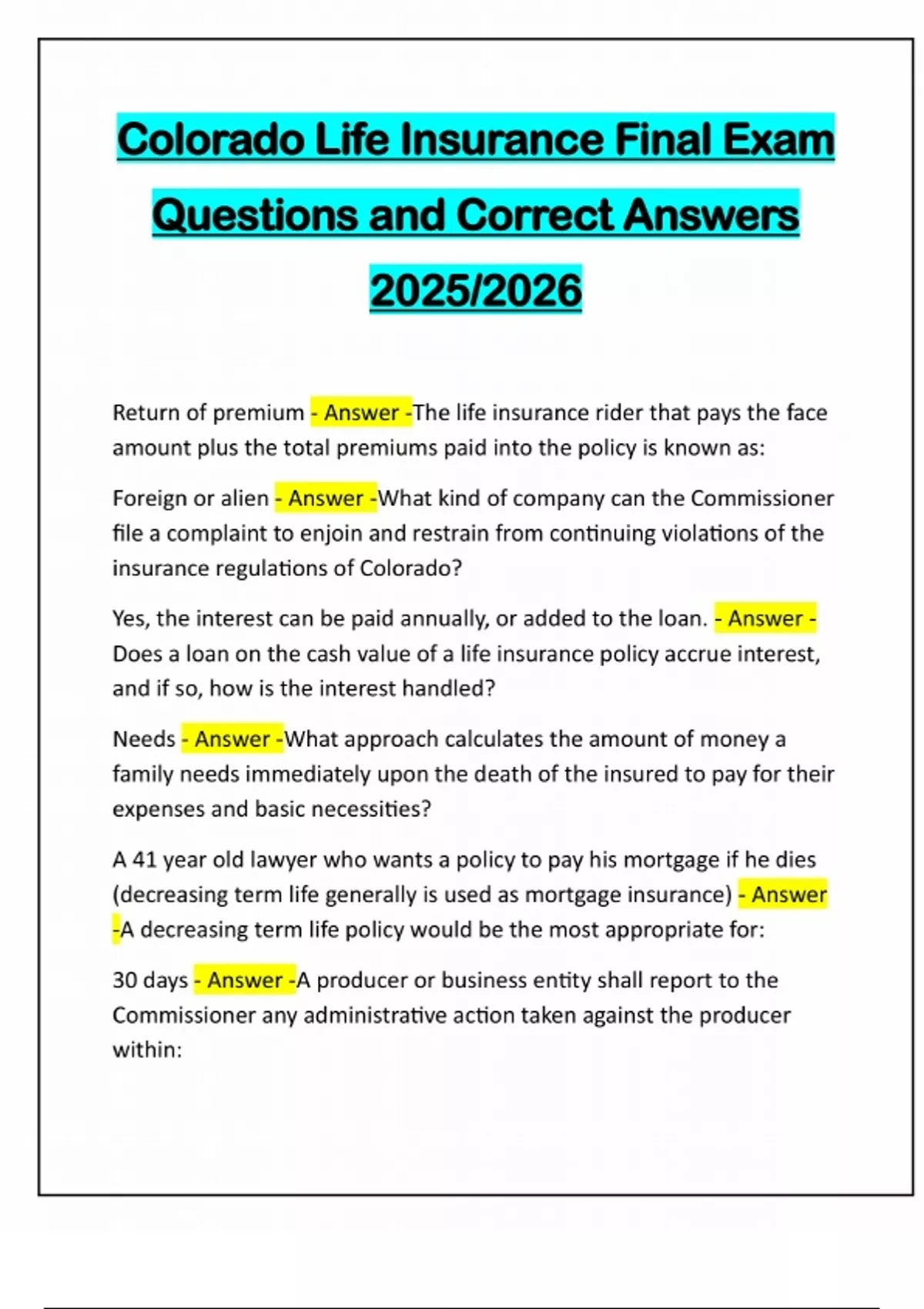 Colorado Life Insurance Final Exam Questions and Correct Answers 2025/2026 Return of premium - Answer -The life insurance rider that pays the face amount plus the total premiums paid into the policy is known as: Foreign or alien - Answer -What kind of company can the Commissioner file a complaint to enjoin and restrain from continuing violations of the insurance regulations of Colorado? Yes, the interest can be paid annually, or added to the loan. - Answer - Does a loan on the cash value of a life insurance policy accrue interest, and if so, how is the interest handled? Needs - Answer -What approach calculates the amount of money a family needs immediately upon the death of the insured to pay for their expenses and basic necessities? A 41 year old lawyer who wants a policy to pay his mortgage if he dies (decreasing term life generally is used as mortgage insurance) - Answer -A decreasing term life policy would be the most appropriate for: 30 days - Answer -A producer or business entity shall report to the Commissioner any administrative action taken against the producer within:Assignment - Answer -Richard is thinking about transferring some of the ownership rights of his policy to his brother Randy. What term is used for this type of transfer? Term policy - Answer -Jeff has limited financial resources, but finds himself in a position where he needs a good deal of protection. A __________would probably best suit his needs at this time. November 7 - Answer -On November 5, Zoe fills out an application for a life policy. On November 6, the agent accepts the premium for the policy. The policy is delivered on November 7. Which date does the Free Look period start?