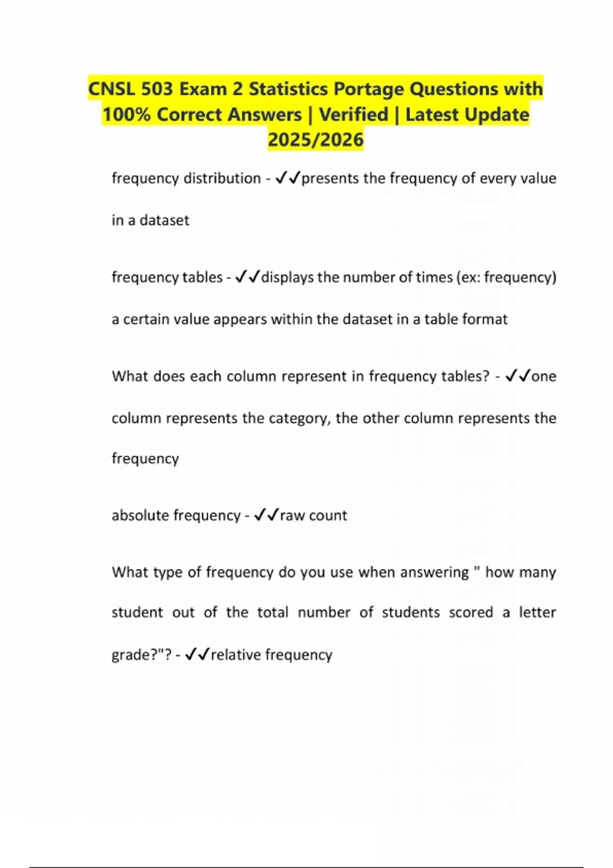 CNSL 503 Exam 2 Statistics Portage Questions with 100% Correct Answers | Verified | Latest Update 2025/2026 frequency distribution - presents the frequency of every value in a dataset frequency tables - displays the number of times (ex: frequency) a certain value appears within the dataset in a table format What does each column represent in frequency tables? - one column represents the category, the other column represents the frequency absolute frequency - raw count What type of frequency do you use when answering " how many student out of the total number of students scored a letter grade?"? - relative frequencyrelative frequency - the ratio between the absolute frequency of a category and the total frequency formula for relative frequency - frequency in category/total frequency What type of frequency do you use when answering the question "how many students scored a B or better?"? - cumulative frequency cumulative frequency - the sum of frequencies of all preceding categories Frequency tables can be used for what type of variables? - qualitative or quantitative variables When using frequency tables for quantitative variables, group the quantitative scores into groups called what? - binsfrequency graphs - pie charts, bar charts, histograms, frequency polygons, stem and leaf plots What type of frequency graphs are used for qualitative variables? - pie charts and bar charts What type of frequency graphs are used f