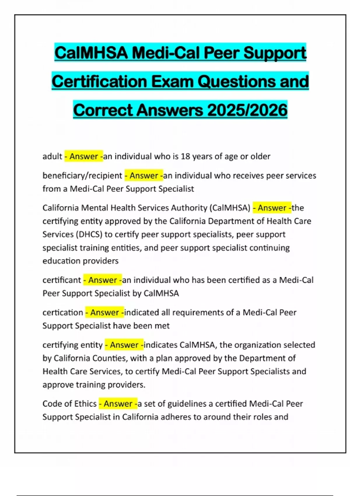 CalMHSA Medi-Cal Peer Support Certification Exam Questions and Correct Answers 2025/2026 adult - Answer -an individual who is 18 years of age or older beneficiary/recipient - Answer -an individual who receives peer services from a Medi-Cal Peer Support Specialist California Mental Health Services Authority (CalMHSA) - Answer -the certifying entity approved by the California Department of Health Care Services (DHCS) to certify peer support specialists, peer support specialist training entities, and peer support specialist continuing education providers certificant - Answer -an individual who has been certified as a Medi-Cal Peer Support Specialist by CalMHSA certication - Answer -indicated all requirements of a Medi-Cal Peer Support Specialist have been met certifying entity - Answer -indicates CalMHSA, the organization selected by California Counties, with a plan approved by the Department of Health Care Services, to certify Medi-Cal Peer Support Specialists and approve training providers. Code of Ethics - Answer -a set of guidelines a certified Medi-Cal Peer Support Specialist in California adheres to around their roles andresponsibilities and levels of responsibility in which they function professionally. consumer - Answer -a person who is receiving mental health and/or substance use disorder (behavioral health services) in a public county behavioral health delivery system. continued education - Answer -the education a Certificant receives to further develop their professional knowledge around best practices, updated laws, and/or specialized training. core competencies - Answer -minimum knowledge base necessary to perform role or job activities as a Medi-Cal Peer Support Specialist in California. county reciprocity - Answer -the recognition of certified Medi-Cal Peer Support Specialists by public county behavioral health plans. culturally appropriate services - Answer -a certified Medi-Cal Peer Support Specialist is promoting engagement in a manner that best aligns with the cultural beliefs and practices of the person they serve. dual relationship - Answer -a Medi-Cal Peer Support Specialist's nontherapeutic relationship with a recipient of care. It includes any a