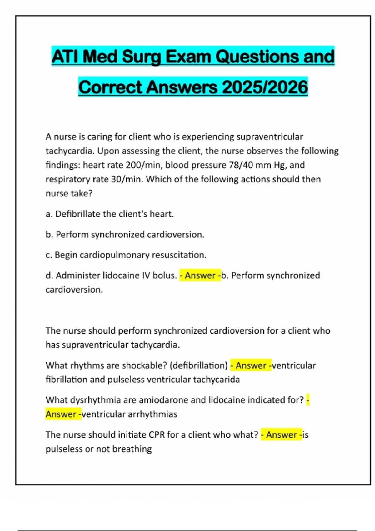 ATI Med Surg Exam Questions and Correct Answers 2025/2026 A nurse is caring for client who is experiencing supraventricular tachycardia. Upon assessing the client, the nurse observes the following findings: heart rate 200/min, blood pressure 78/40 mm Hg, and respiratory rate 30/min. Which of the following actions should then nurse take? a. Defibrillate the client's heart. b. Perform synchronized cardioversion. c. Begin cardiopulmonary resuscitation. d. Administer lidocaine IV bolus. - Answer -b. Perform synchronized cardioversion. The nurse should perform synchronized cardioversion for a client who has supraventricular tachycardia. What rhythms are shockable? (defibrillation) - Answer -ventricular fibrillation and pulseless ventricular tachycarida What dysrhythmia are amiodarone and lidocaine indicated for? - Answer -ventricular arrhythmias The nurse should initiate CPR for a client who what? - Answer -is pulseless or not breathingA nurse is preparing a client who has supraventricular tachycardia for elective cardioversion. Which of the following medications should the nurse instruct the client to withhold for 48 hr prior to cardioversion? A. Enoxaparin B. Metformin C. Diazepam D. Digoxin - Answer -D. digoxin Cardiac glycosides, such as digoxin, are withheld prior to cardioversion. These medications can increase ventricular irritability and put the client at risk for ventricular fibrillation after the synchronized countershock of cardioversion _______ are usually given prior to cardioversion to reduce anxiety and minimize discomfort with the procedure. - Answer -Sedatives like diazepam Metformin is held before what kind of procedures? Example? Why? - Answer -Ones that involve contrast dye like cardiac catheterization, in order to prevent kidney damage. __________ prevent blood clots that can be released into the circulatory system after cardioversion. - Answer -Anticoagulants like enoxaparin What kind of drugs are withheld prior to cardioversion? - Answer - cardiac glycosides like digoxinexopthalmosis - Answer -condition produced by hyperthyroidism in which the eyeballs protrude beyond their normal protective orbit because of swelling in the tissues behind them entropion - Answer -the inversion of the edge of an eyelid ectropion - Answer -the eversion of the edge of an eyelid ptosis - Answer -drooping A nurse is caring for a client who has emphysema and is receiving mechanical ventilation. The client appears anxious and restless, and the high-pressure alarm is sounding. Which of the following actions should the nurse take first? A. Obtain ABGs. B. Administer propofol to the client. C. Instruct the client to allow the machine to breathe for them. D. Disconnect the machine and manually ventilate the client. - Answer - C. Instruct the client to allow the machine to breathe for them. When providing client care, the nurse should first use the least restrictive intervention. Therefore, the first action the nurse should take is to provide verbal instructions and emotional support to help the client relax and allow the ventilator to work. Clients can exhibit anxiety and restlessness when trying to "fight the ventilator." A nurse is caring for a client who has a potassium level of 3. Which of the following assessment findings should the nurse expect? A. Positive Trousseau's sign B. 4+ deep tendon reflexes