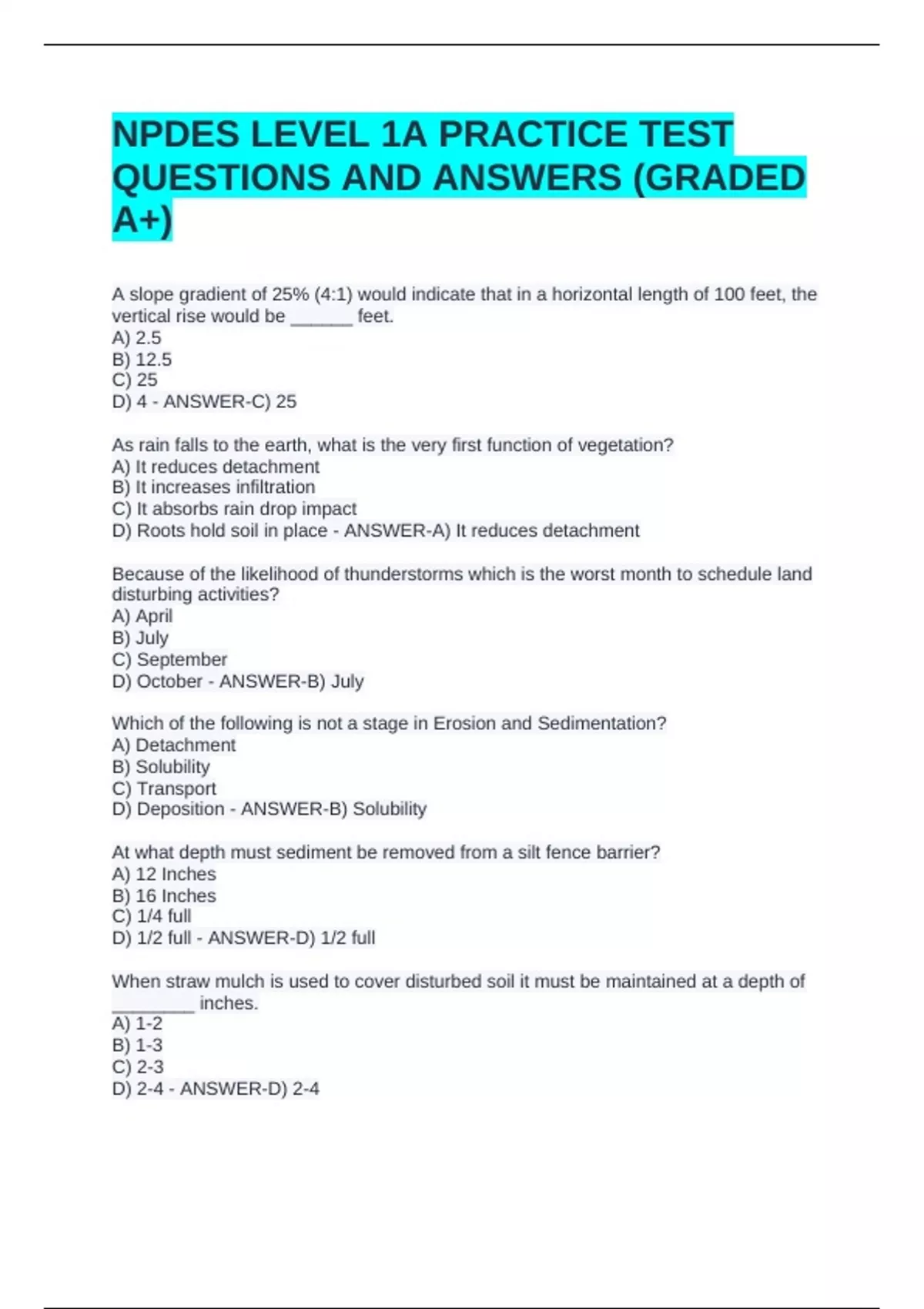 A slope gradient of 25% (4:1) would indicate that in a horizontal length of 100 feet, the