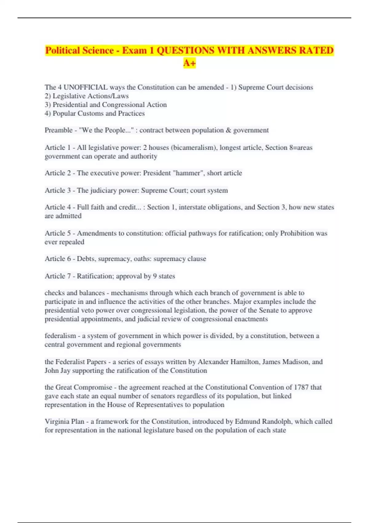 Political Science - Exam 1 QUESTIONS WITH ANSWERS RATED