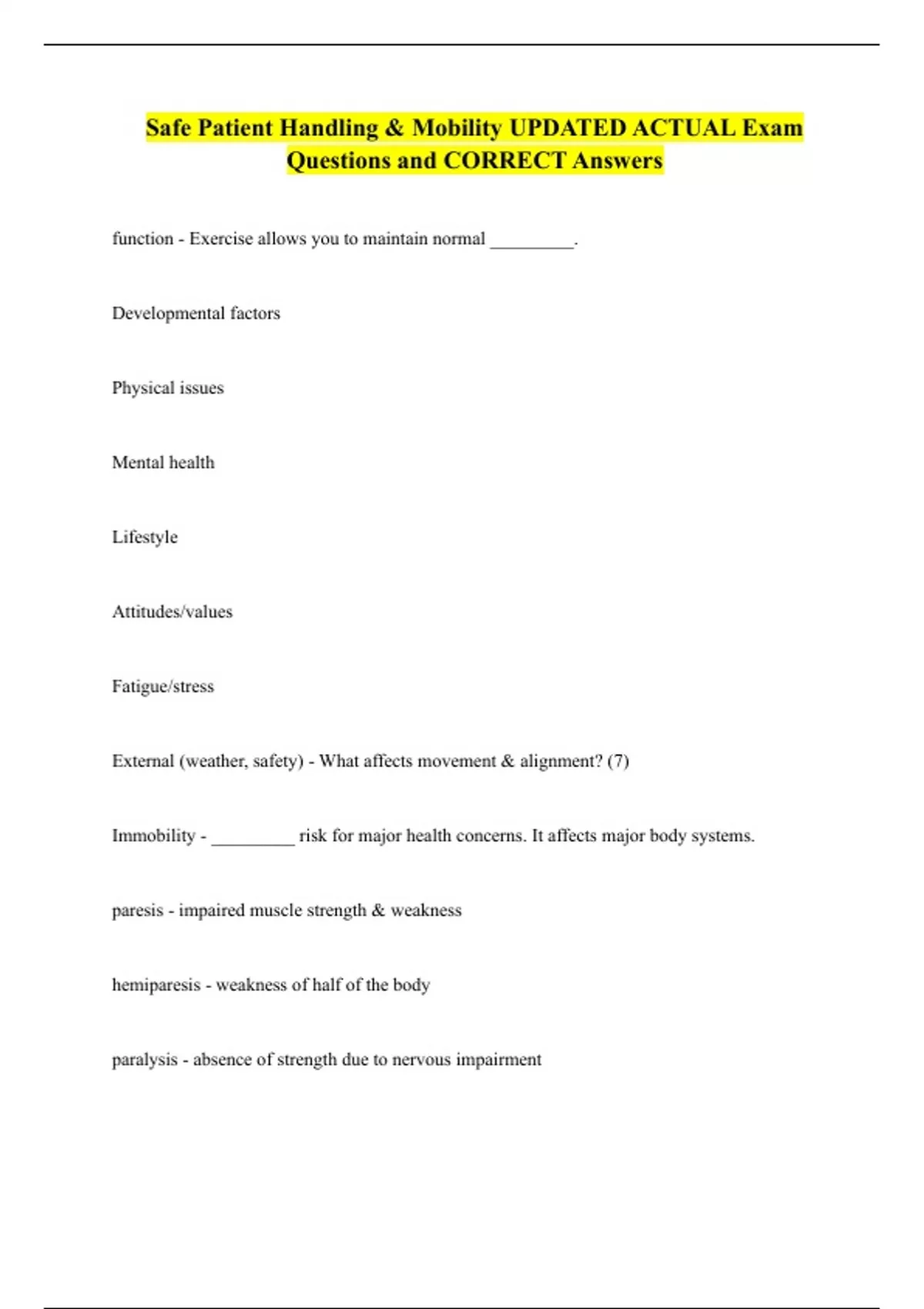 Safe Patient Handling & Mobility UPDATED ACTUAL Exam