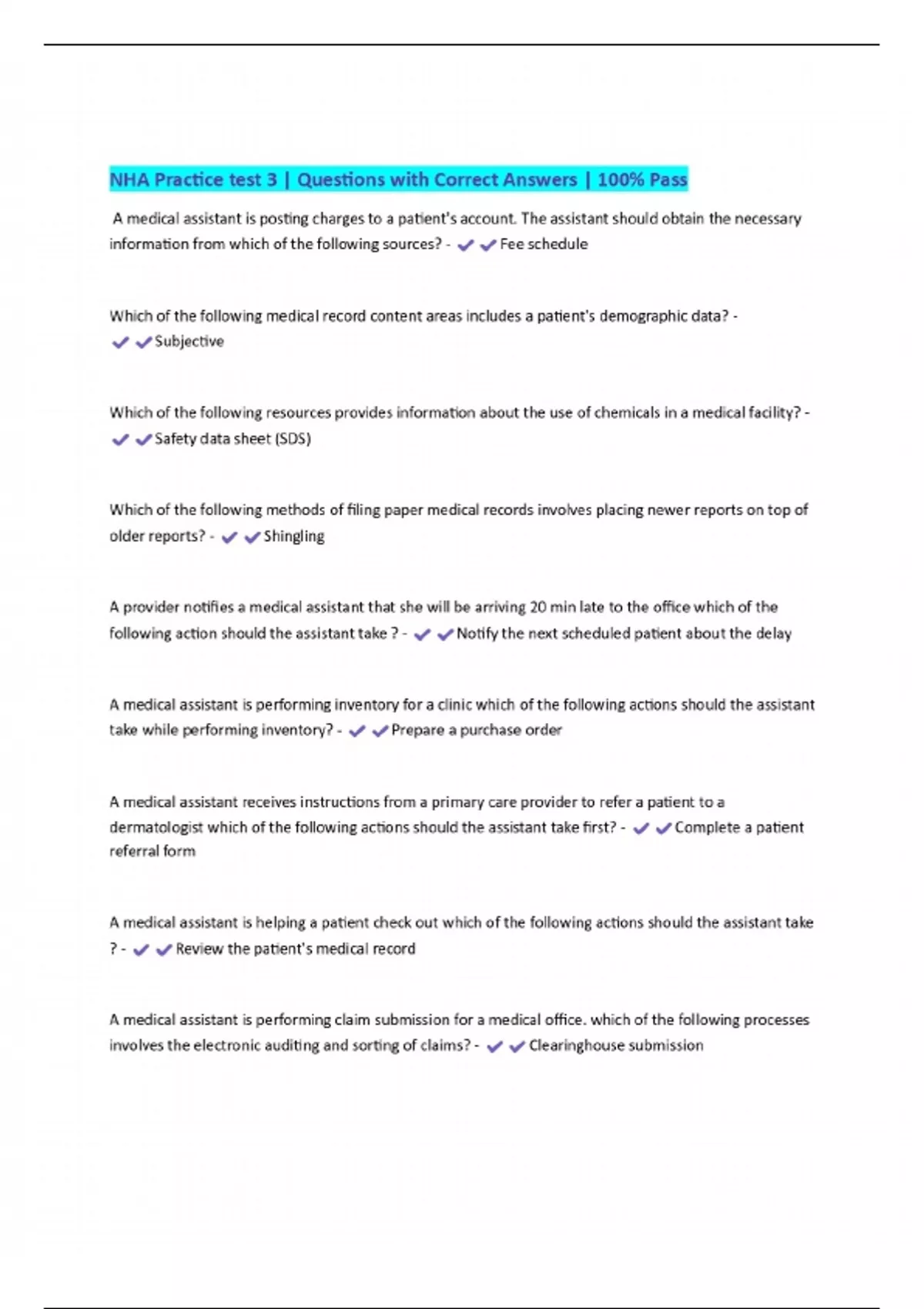 NHA Practice test 3 | Questions with Correct Answers | 100% Pass