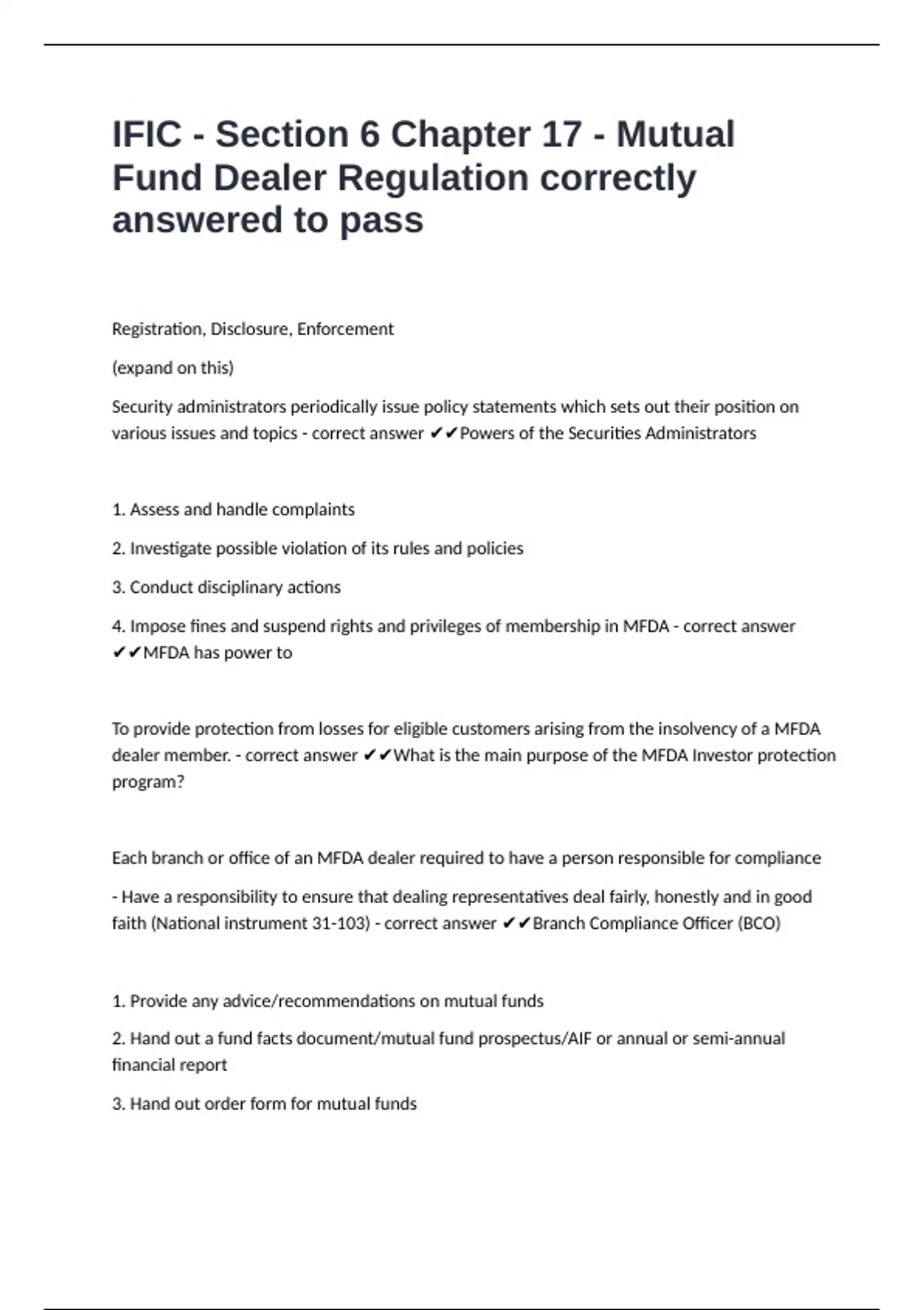 dealer member. - correct answer ✔✔What is the main purpose of the MFDA Investor protection