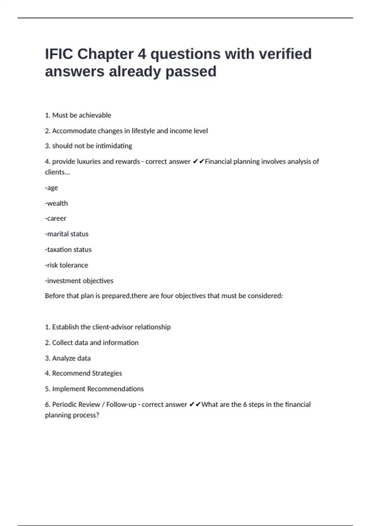 6. Periodic Review / Follow-up - correct answer ✔✔What are the 6 steps in the financial