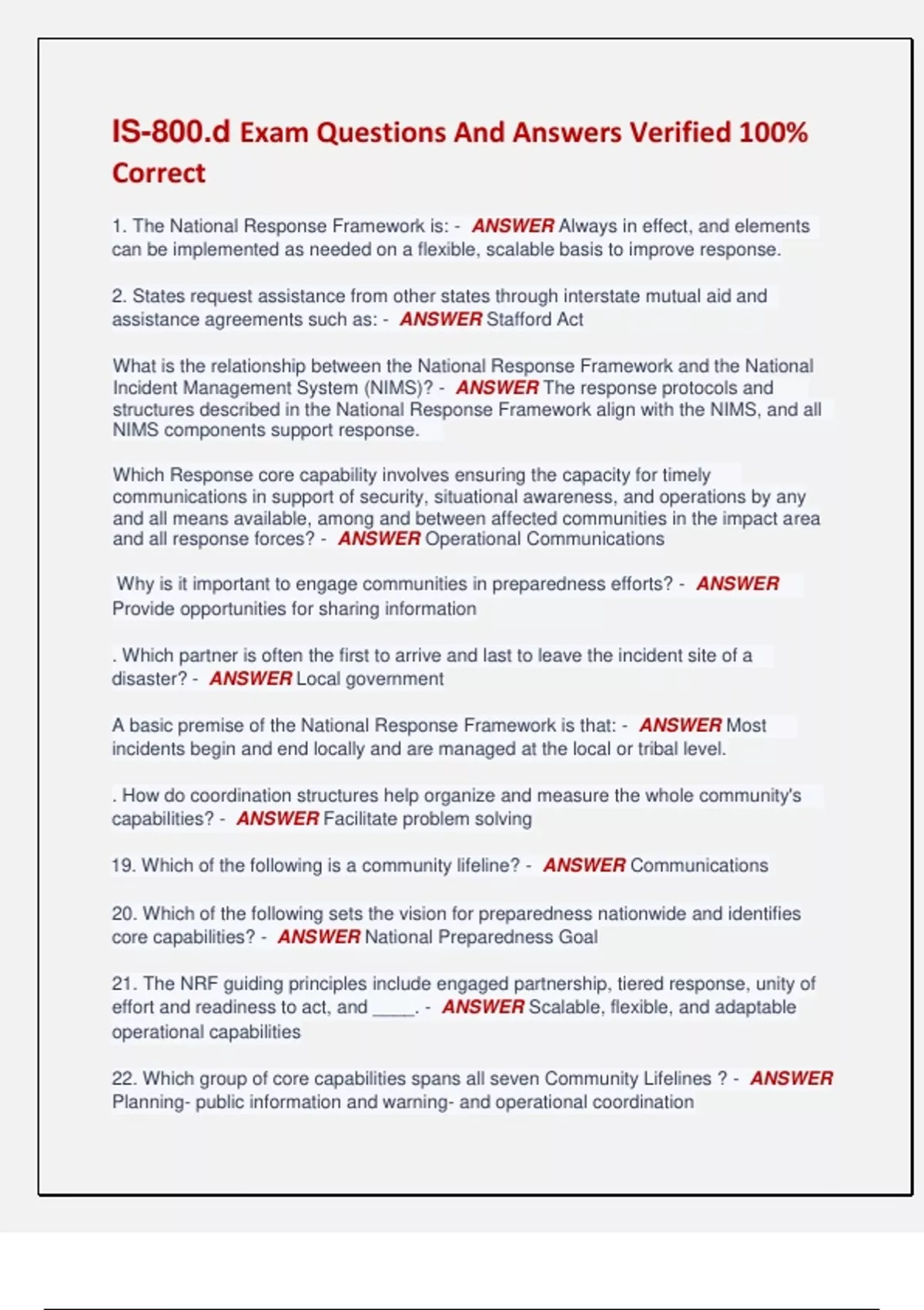 1. The National Response Framework is: - ANSWER Always in effect, and elements