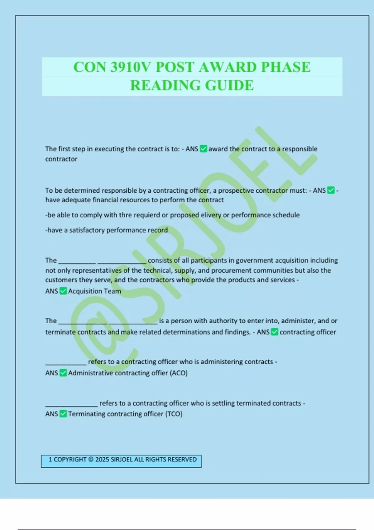 The first step in executing the contract is to: - ANS award the contract to a responsible contractor To be determined responsible by a contracting officer, a prospective contractor must: - ANS - have adequate financial resources to perform the contract -be able to comply with thre requierd or proposed elivery or performance schedule -have a satisfactory performance record The __________ _____________ consists of all participants in government acquisition including not only representatiives of the technical, supply, and procurement communities but also the customers they serve, and the contractors who provide the products and services - ANS Acquisition Team The _____________ _____________ is a person with authority to enter into, administer, and or terminate contracts and make related determinations and findings. - ANS contracting officer ___________ refers to a contracting officer who is administering contracts - ANS Administrative contracting offier (ACO) ______________ refers to a contracting officer who is settling terminated contracts - ANS Terminating contracting officer (TCO) 2 COPYRIGHT © 2025 SIRJOEL ALL RIGHTS RESERVED The ___________ is an individual, including a contracting offier's technical representative (COTR), designated and authorized in writing by the contracting officer to perform specific technical or administrative functions - ANS Contracting officer's representative (COR) (their authority shall be designated in writing) What is FAR part 42? - ANS Contract Administration and Audit Services What is the purpose of contract administration? - ANS To ensure that the buyer receives, the supplies and/or services at the level of quality and in the time required by the contract and that the seller receives payment. When should contract adminstration begin? - ANS although planning for contract administration begins in the pre-award phase, actual contract administration begins after a contract is awarded A ________ __________ ___________ is an office that primarily performs assigned post award functions related to the administration of contracts, but may perform pre award functions if assigned. - ANS Contract administration office (CAO) DoD typically relies on _______ to carry out contract administrative functions for supply contracts. - ANS DCMA (Defense Contract Management Agency) T or F: As provided in agency procedures, contracting officers may delegate contract administration or specialized support services, either through interagency agreements or by direct request to the cognizant CAO listed in the Federal Directory of Contract Administration Services Components. - ANS True What is an online respository for contractual instruments and supporting documents, and DoD's primary tool for electronic distribution of contract documents and contract data - ANS Electroni