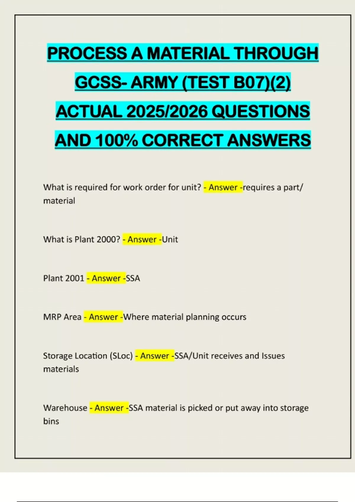 PROCESS A MATERIAL THROUGH GCSS- ARMY (TEST B07)(2) ACTUAL 2025/2026 QUESTIONS AND 100% CORRECT ANSWERS What is required for work order for unit? - Answer -requires a part/ material What is Plant 2000? - Answer -Unit Plant 2001 - Answer -SSA MRP Area - Answer -Where material planning occurs Storage Location (SLoc) - Answer -SSA/Unit receives and Issues materials