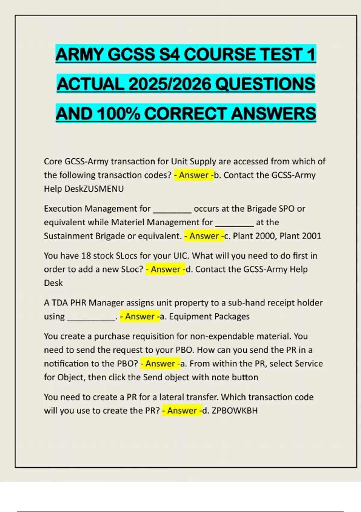 ARMY GCSS S4 COURSE TEST 1 ACTUAL 2025/2026 QUESTIONS AND 100% CORRECT ANSWERS Core GCSS-Army transaction for Unit Supply are accessed from which of the following transaction codes? - Answer -b. Contact the GCSS-Army Help DeskZUSMENU Execution Management for ________ occurs at the Brigade SPO or equivalent while Materiel Management for ________ at the Sustainment Brigade or equivalent. - Answer -c. Plant 2000, Plant 2001 You have 18 stock SLocs for your UIC. What will you need to do first in order to add a new SLoc? - Answer -d. Contact the GCSS-Army Help Desk A TDA PHR Manager assigns unit property to a sub-hand receipt holder using __________. - Answer -a. Equipment Packages You create a purchase requisition for non-expendable material. You need to send the request to your PBO. How can you send the PR in a notification to the PBO? - Answer -a. From within the PR, select Service for Object, then click the Send object with note button You need to create a PR for a lateral