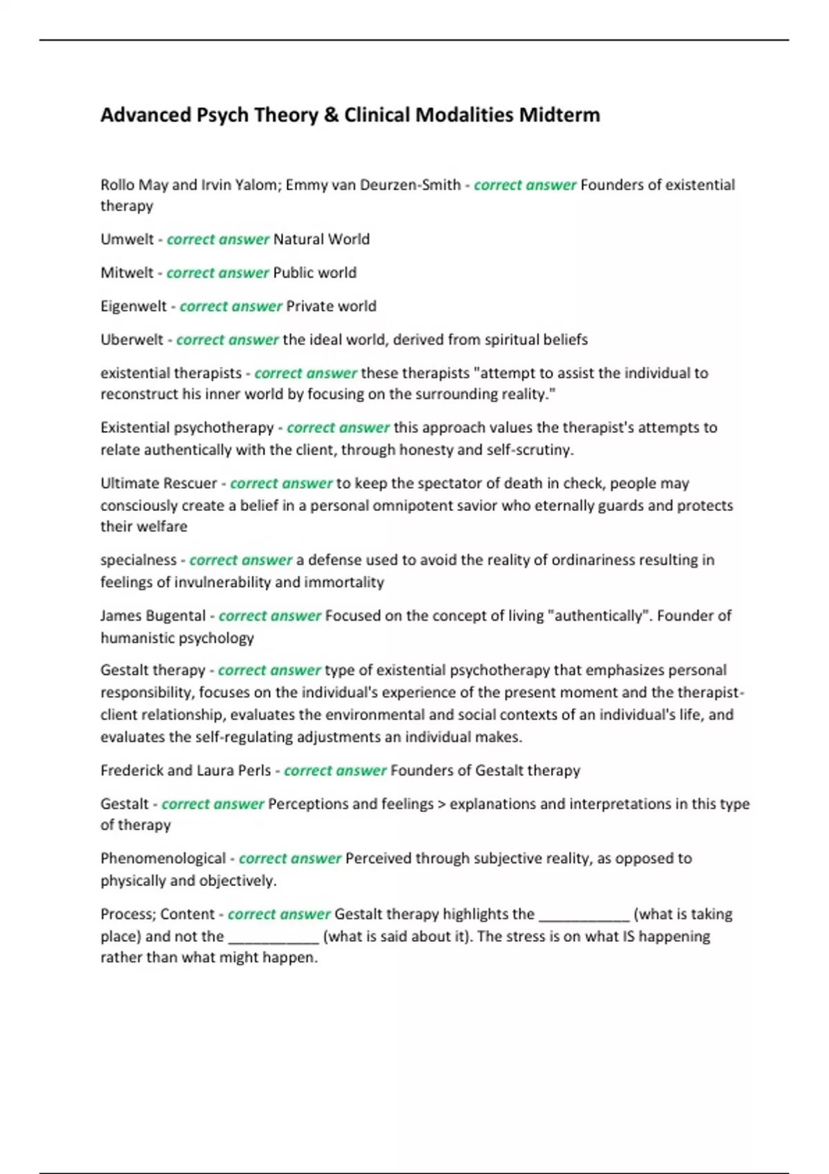 Rollo May and Irvin Yalom; Emmy van Deurzen-Smith - correct answer Founders of existential therapy Umwelt - correct answer Natural World Mitwelt - correct answer Public world Eigenwelt - correct answer Private world Uberwelt - correct answer the ideal world, derived from spiritual beliefs existential therapists - correct answer these therapists "attempt to assist the individual to reconstruct his inner world by focusing on the surrounding reality." Existential psychotherapy - correct answer this approach values the therapist's attempts to relate authentically with the client, through honesty and self-scrutiny.