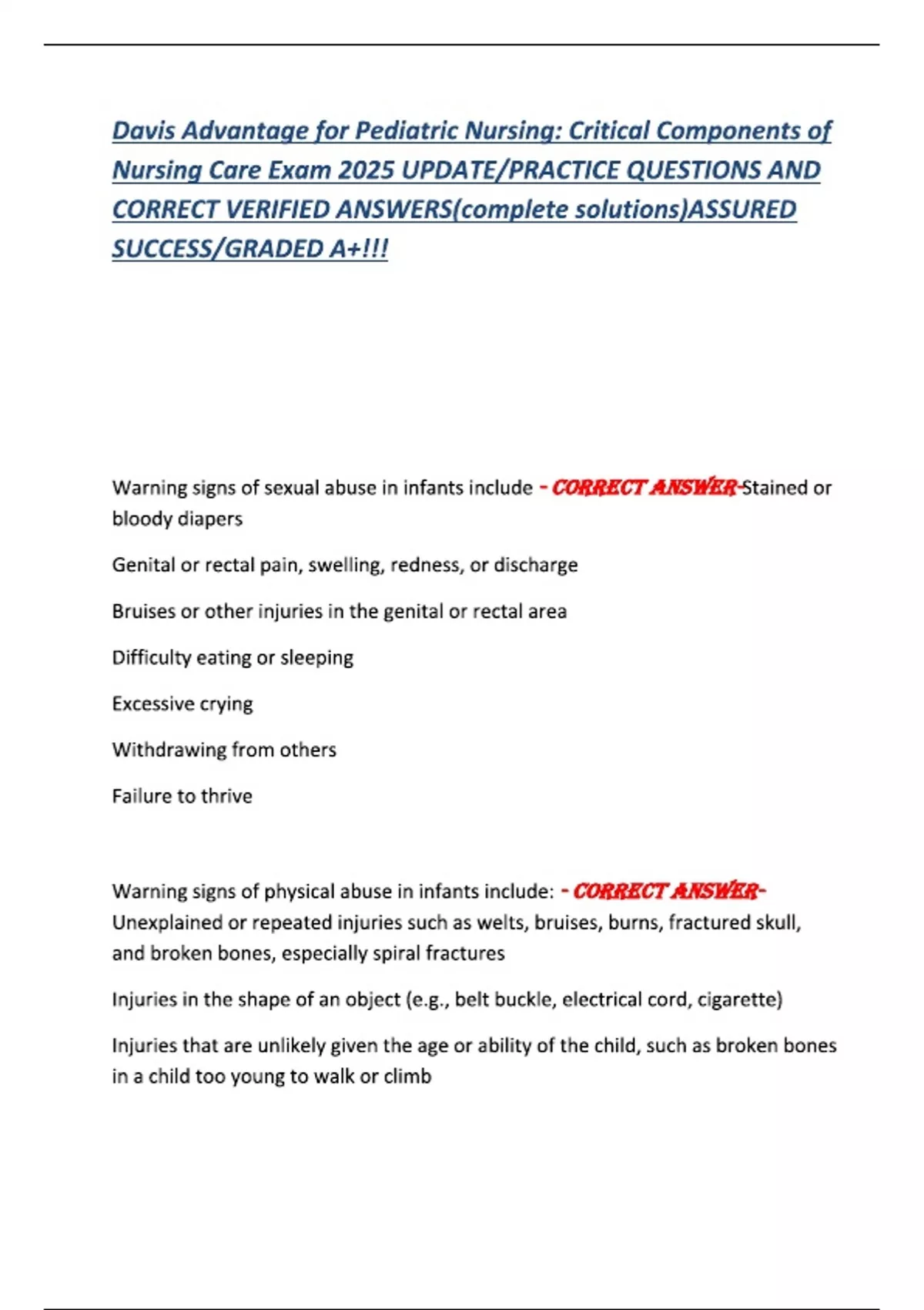TEST BANK For Davis Advantage for Pediatric Nursing Critical Components of Nursing Care, 3rd Edition by Kathryn Rudd, Complete Chapter's 1 - 22, 100 % Verified