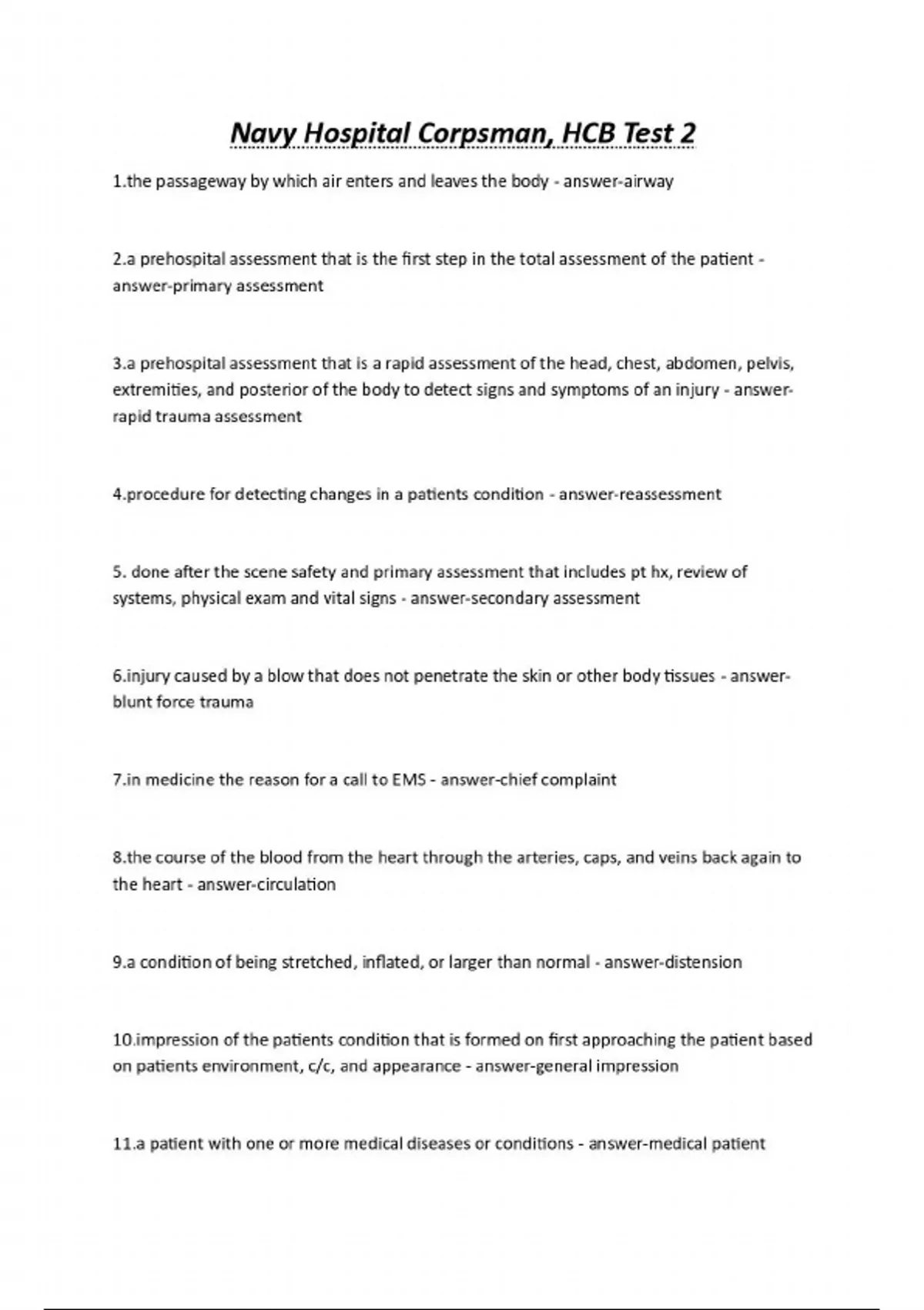 Navy Hospital Corpsman, HCB Test 2 passageway by which air enters and leaves the body - answer-airway 2.a prehospital assessment that is the first step in the total assessment of the patient - answer-primary assessment 3.a prehospital assessment that is a rapid assessment of the head, chest, abdomen, pelvis, extremities, and posterior of the body to detect signs and symptoms of an injury - answer-rapid trauma assessment dure for detecting changes in a patients condition - answer-reassessment 5. done after the scene safety and primary assessment that includes pt hx, review of systems, physical exam and vital signs - answer-secondary assessment y caused by a blow that does not penetrate the skin or other body tissues - answer-blunt force trauma medicine the reason for a call to EMS - answer-chief complaint course of the blood from the heart through the arteries, caps, and veins back again to the heart - answer-circulation 9.a condition of being stretched, inflated, or larger than normal - answer-distension ssion of the patients condition that is formed on first approaching the patient based on patients environment, c/c, and appearance - answer-general impression 11.a patient with one or more medical diseases or conditions - answer-medical patient...
