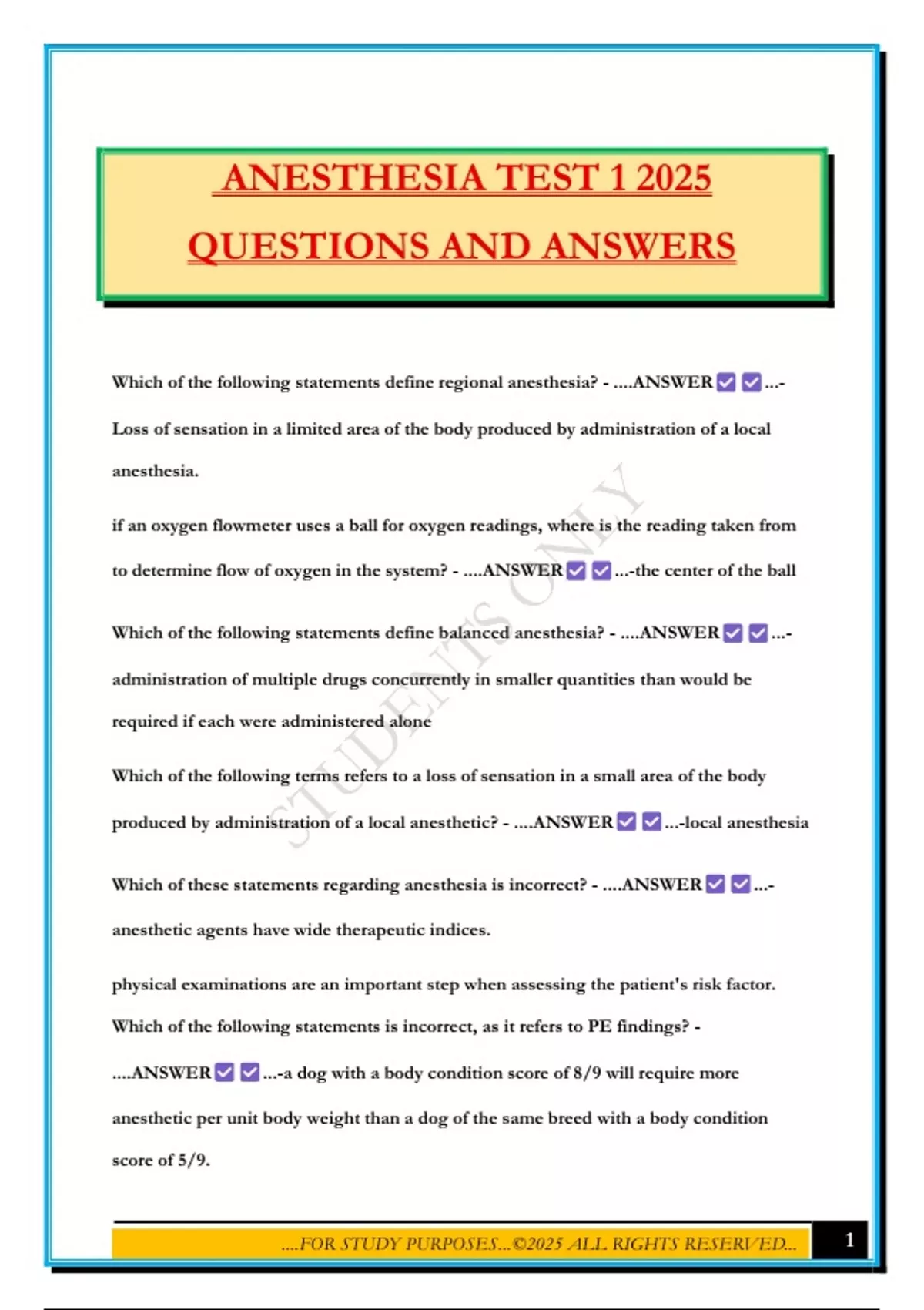 ANESTHESIA TEST 1 2025 QUESTIONS AND ANSWERS