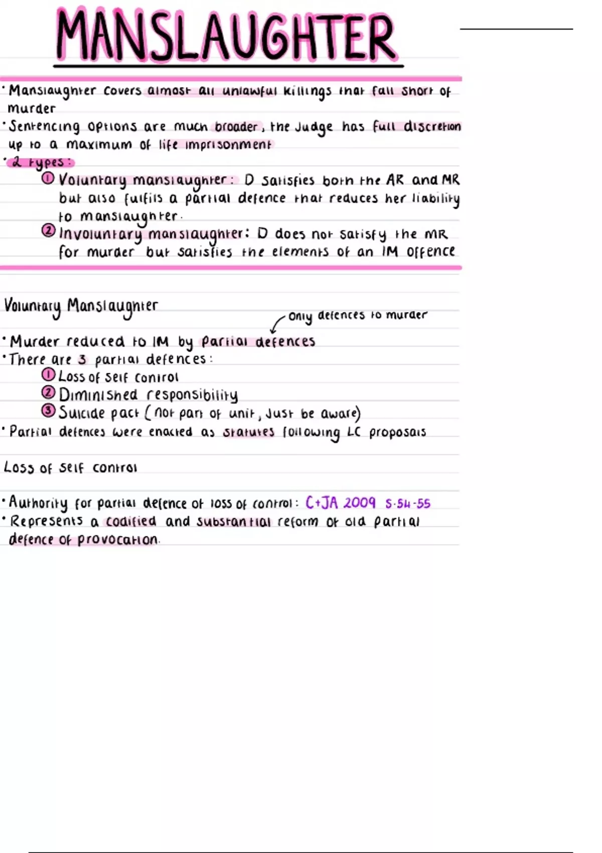 Voluntary Manslaughter only defences to murder