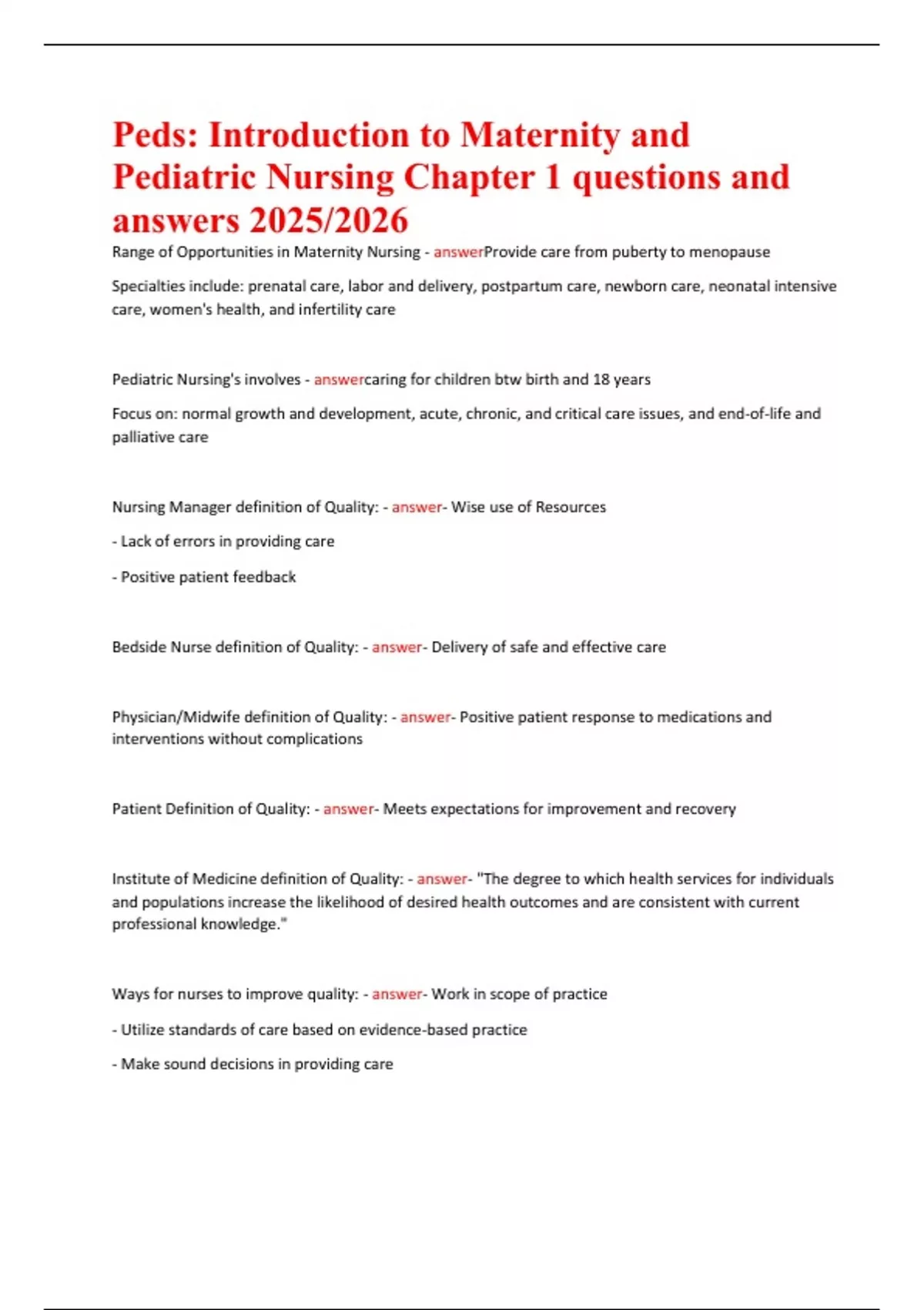 Prepare for your maternity and pediatric nursing courses and exams with this comprehensive Q&A document based on Chapter 1: Introduction to Maternity and Pediatric Nursing. This resource is updated for 2025/2026 and covers foundational concepts every nursing student must master in maternal-child care.