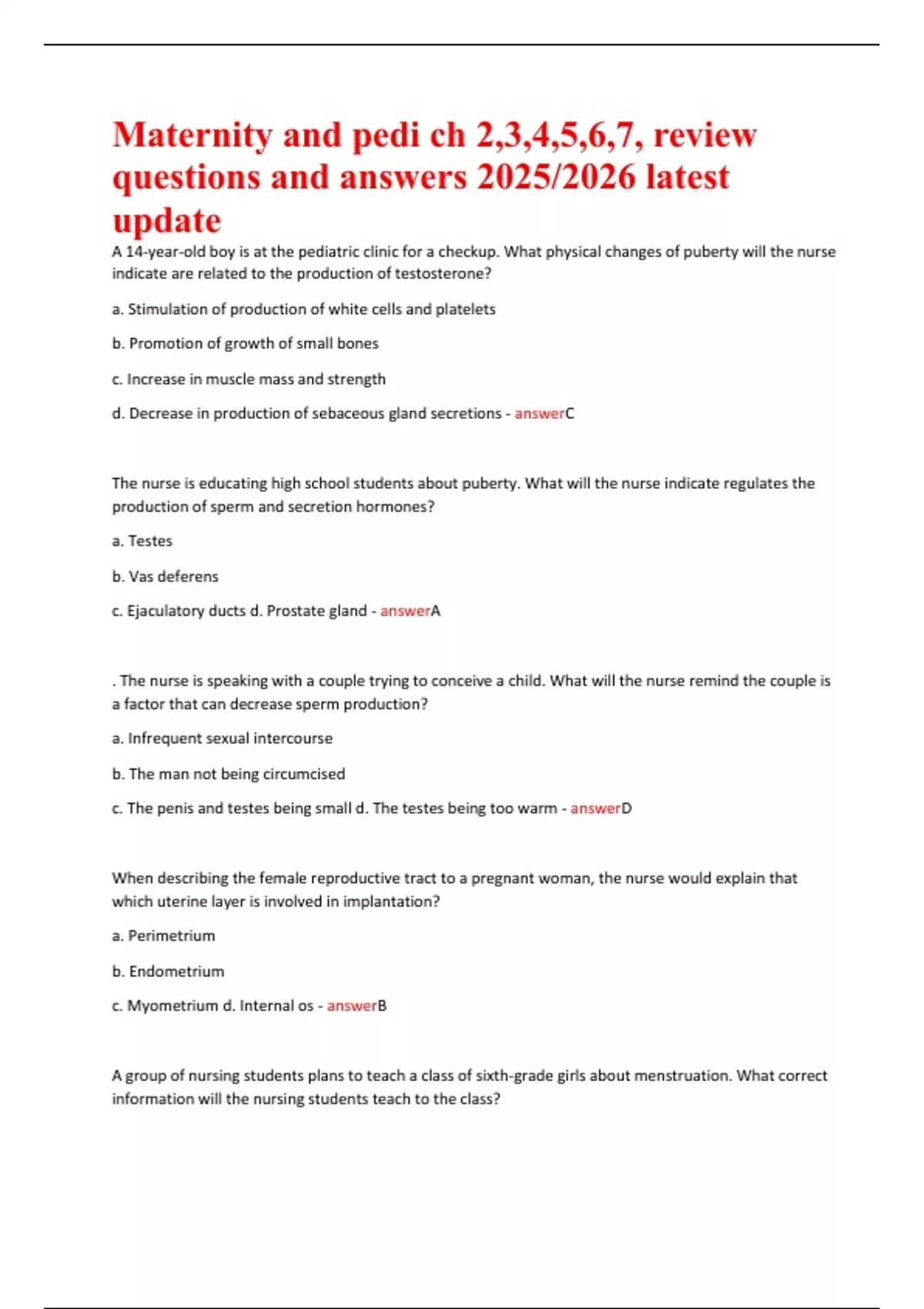 Chapters 2–7: Maternity and Pediatric Nursing Care 2025/2026 – Comprehensive Q&A Review | NCLEX, ATI, HESI Exam Prep (Pregnancy, Puberty, Fetal Development, Labor, and Birth)