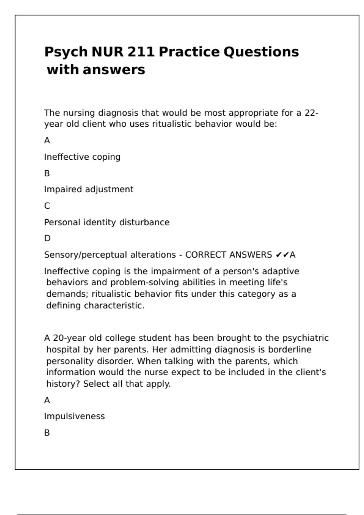 Self-destructive behavior - CORRECT ANSWERS ✔✔A,B,E |/ |/ |/ |/ |/